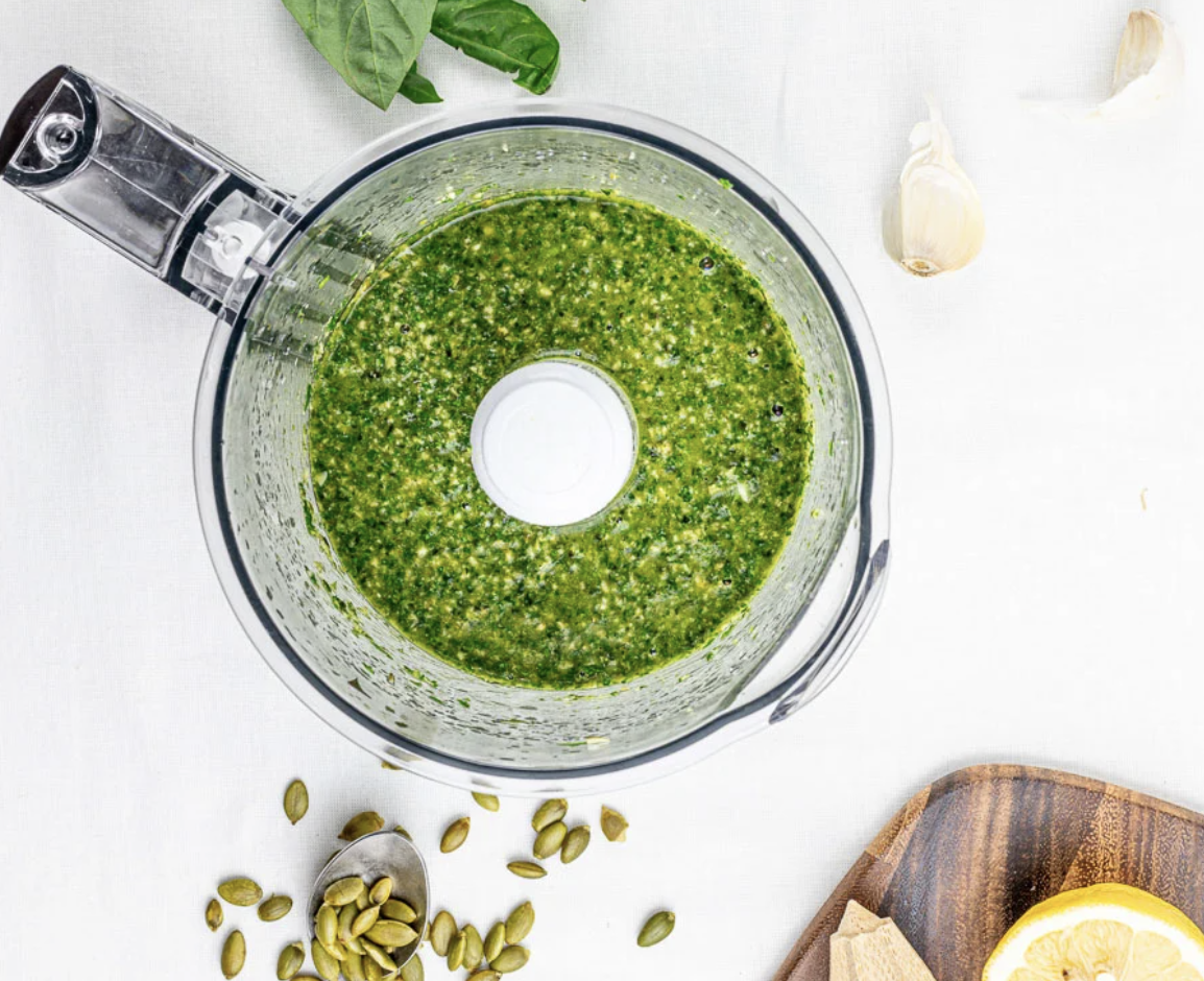 - Add the pumpkin seeds, garlic, basil, parsley, and lemon juice to your food processor.
