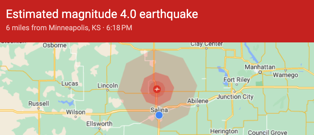An earthquake with an estimated magnitude of 4.0 took place just outside of Minneapolis. Reports are that it was felt as far as Abilene.