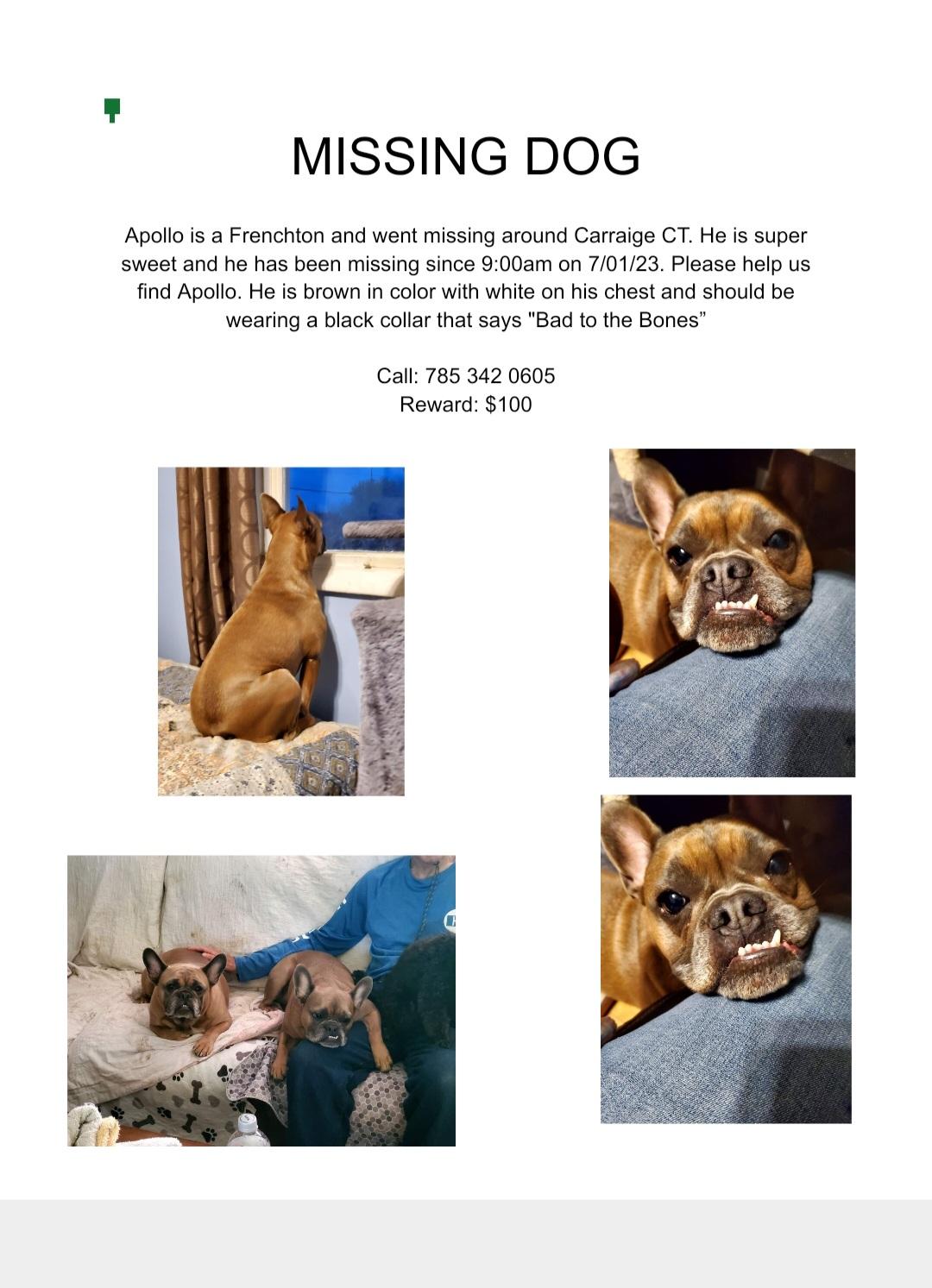 Apollo is a Frenchton and went missing around Carraige Ct. He is super sweet and he has been missing since 9 am on July 1. Please help us find Apollo. He is brown in color with white on his chest and should be wearing a black collar that says Bad to the Bone. Call 785-342-0605. Reward is $100.