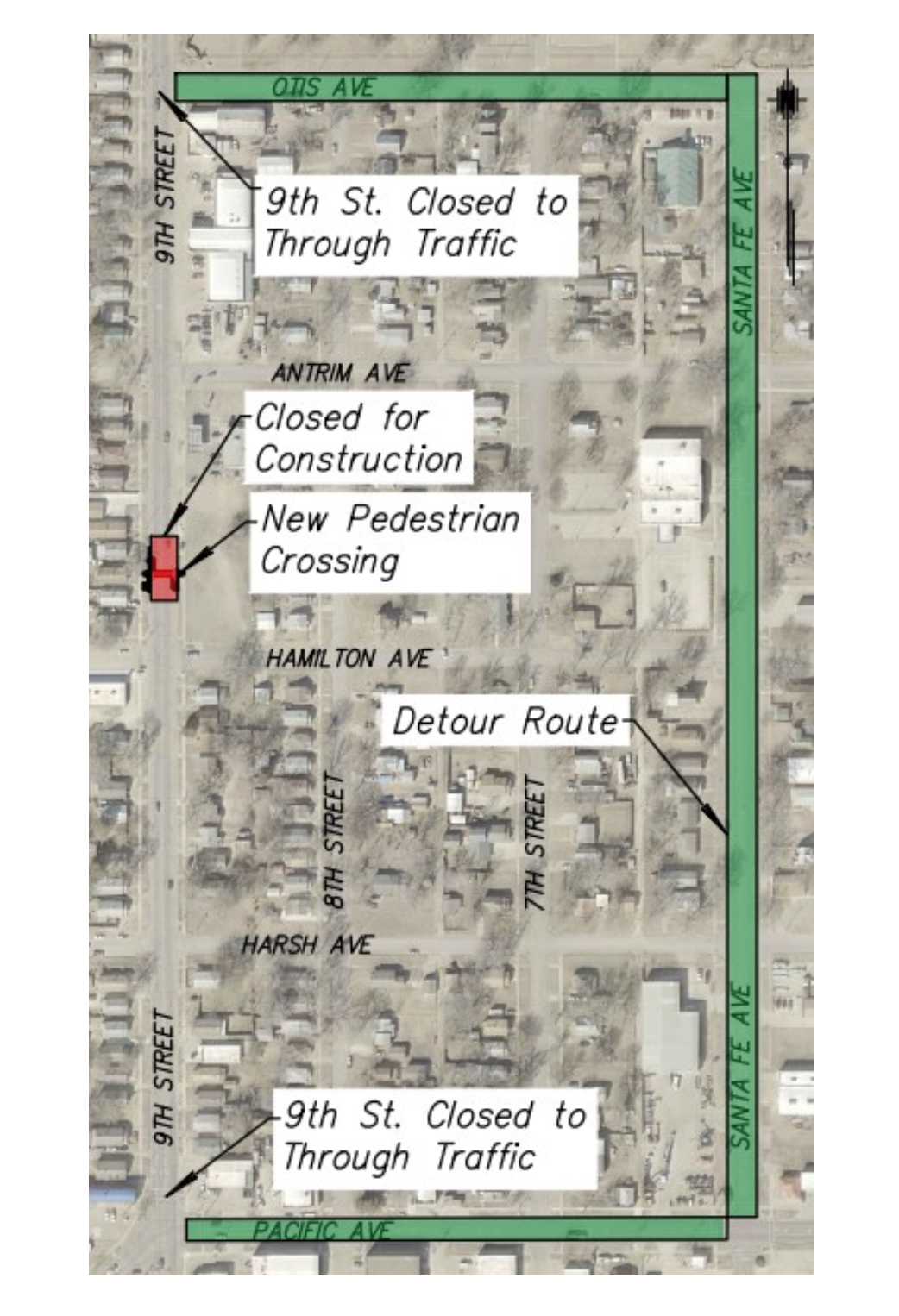 Beginning Monday, September 29, RAM Contracting of Salina, Kansas, will begin construction of a curb extension and pedestrian crossing on 9th Street between Hamilton Avenue and Antrim Avenue.