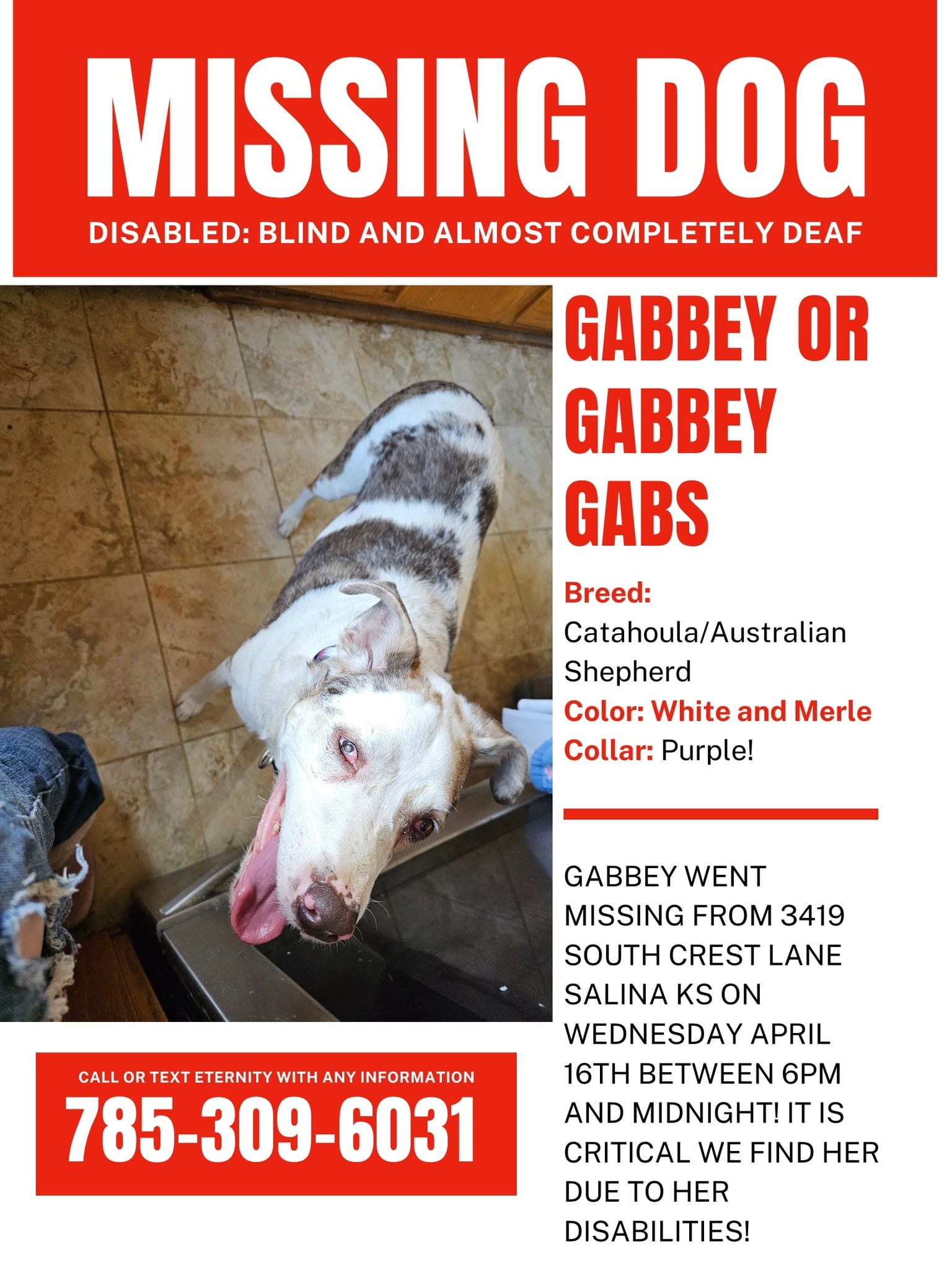 Gabbey went missing from 3419 South Crest Lane, Salina, KS between 6 PM and midnight on Wednesday, April 16th.