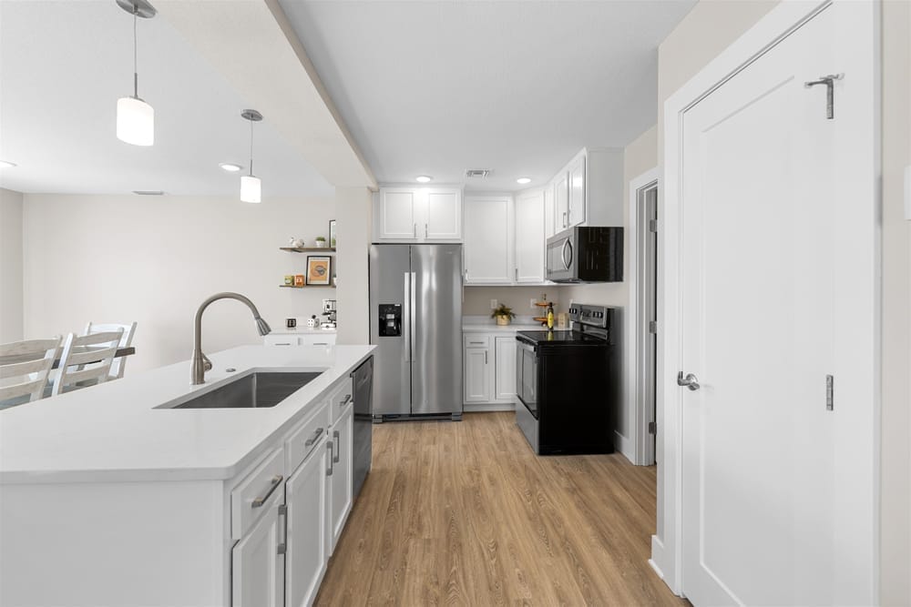 - Modern Kitchen: Stainless steel appliances, ample counter space, and a bar seating area flow into the dining space.