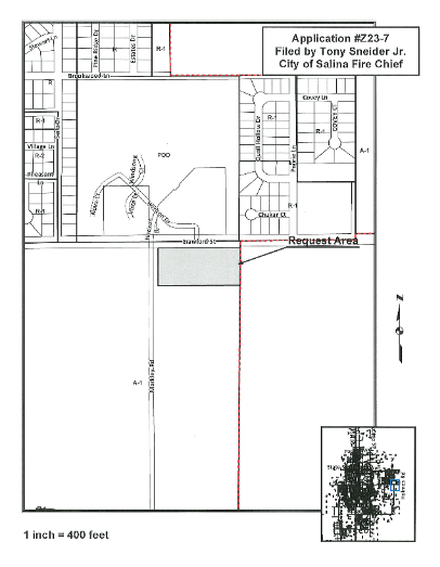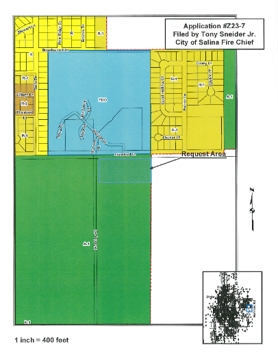 In Monday's City Commission meeting, the commissioners deliberated on Application #223-7, submitted by Chief Tony Sneidar, Jr. on behalf of the Salina Fire Department. The application sought a change in zoning district classification from A-1 (Agricultural) to P (PF) [Public Use - Public Facilities] to pave the way for the construction of a modern fire station facility. The 4.57-acre parcel of land in question is situated at the north end of the Berkley Family Recreation Area, with the proposed fire station located at the southeast corner of E Crawford St and Markley Rd, bearing the address 2600 E. Crawford St.