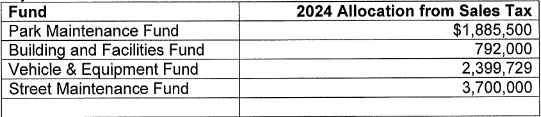 A comparative table highlights changes from the July 3, 2023, study session, emphasizing that annual allocations from the Sales Tax Capital Fund will be re-evaluated annually to ensure availability for increased allocations.