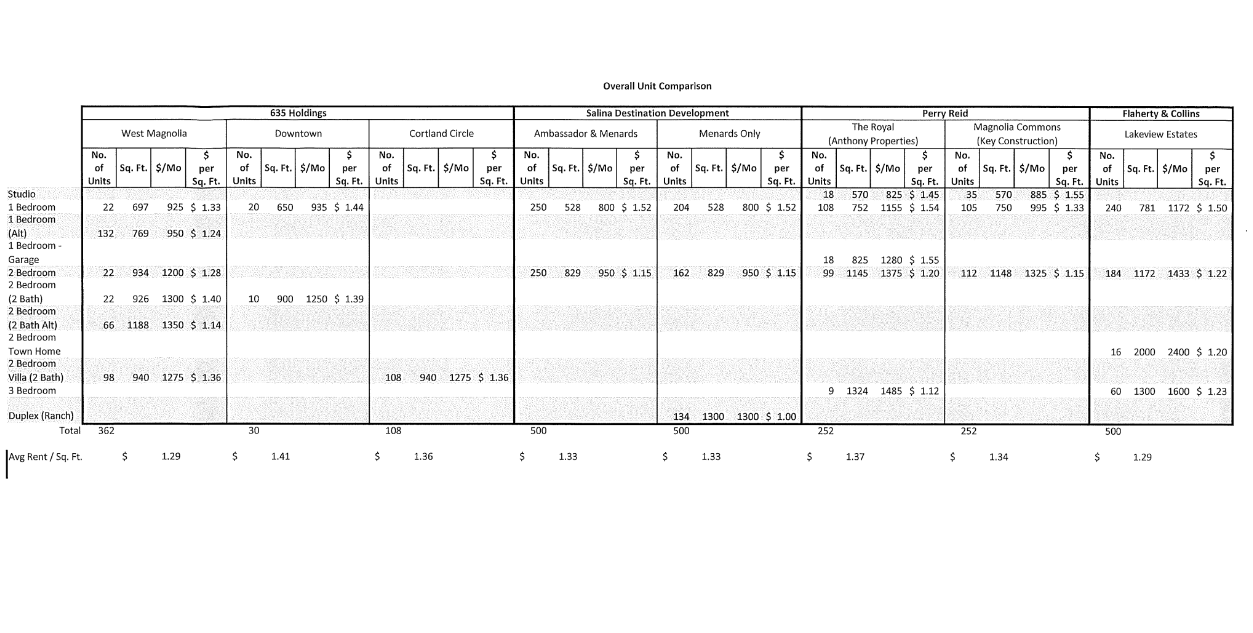 It is the City’s intention to enter into a partnership with one or more private developers to build new market-rate apartments. The City desires that a developer (or group of developers) construct a minimum of 500 rental units on one or more development sites. The City will accept development proposals from developers who propose a project of at least 150 rental units. If such a proposal were accepted it would necessitate the City engaging other developers who would then construct additional projects to reach the City’s desired goal of at least 500 new rental units. The City seeks market rate apartments with a mix of studio, one, two and three bedroom units. The mix of unit types will be proposed by the developer and will be subject to final negotiation between the City and the developer and will be based on the developer’s recommendation about the type of development that would be most likely to succeed in the Salina market. The units may be spread over multiple sites but the City desires that the units be constructed as efficiently as possible to both lower costs and accelerate the delivery of the multifamily units and accelerate the development process.