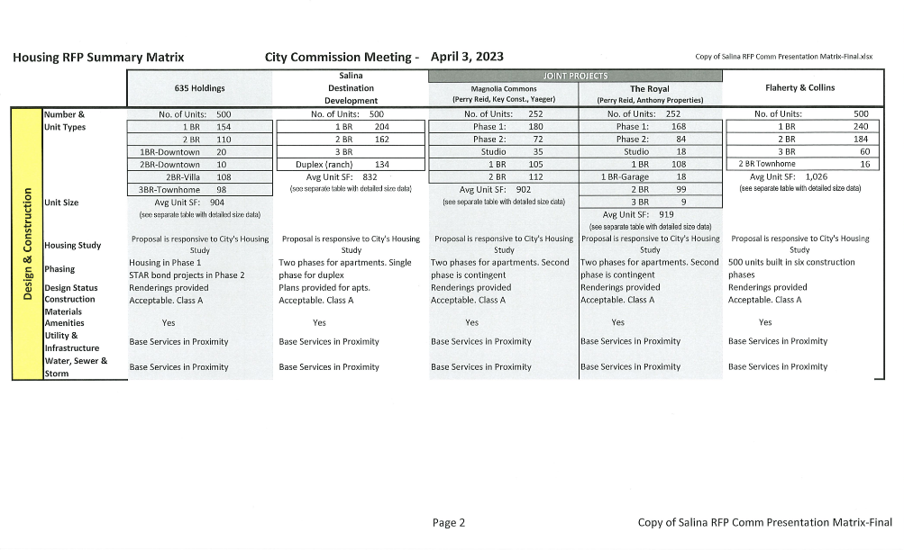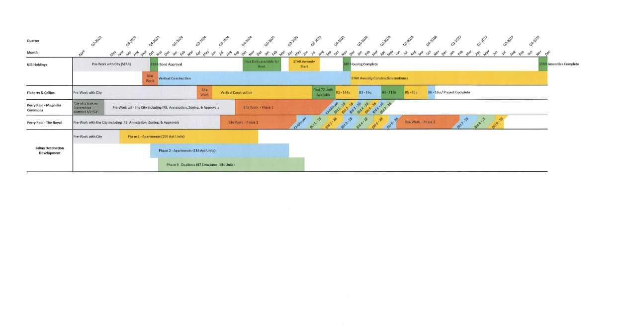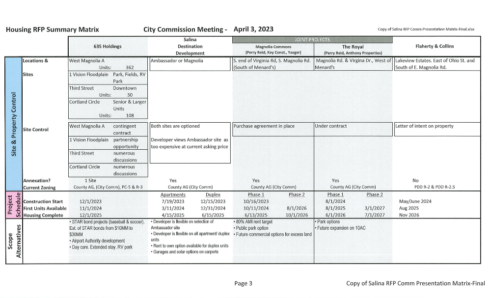 Beginning in 2021 through today, City staff has continually engaged with interested developers for various housing projects across product types and price points in accordance with the recommendations of the Live Salina Housing Assessment and Strategic Plan. Most notably, The Drever Partner Group, began working with Salina in June of 2021, meeting with major employers, the City and County Commissions, and other community stakeholders before any State or federal funding became available. The City did not reach any agreement with the Drever Partner Group.