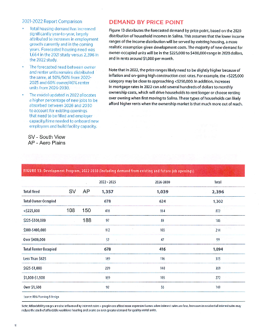 Since 2016 Salina has been successful in becoming the chosen expansion location for several economic development prospects. Saline County and the City of Salina have supported these expansions through revenue bond financings totaling over $600 million. According to the Salina Chamber of Commerce, Salina is now projecting over 2,000 new jobs in the next 5 years; with well over half of those new jobs anticipated within the next one to two years. Due to the anticipation of growth and business expansions, the City worked again with RDG Planning and Design Group to update the 2015 Live Salina Housing Assessment and Strategic Plan in 2021 and again in 2022. The City wanted the updated plan to objectively assess the housing development challenges and costs with the anticipation that developers would seek financial assistance or incentives to build market-rate housing. Results of the 2022 study show a need for nearly 2,400, units by 2030 with a recognition that this number is not static and will increase as additional economic development occurs.