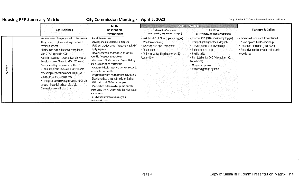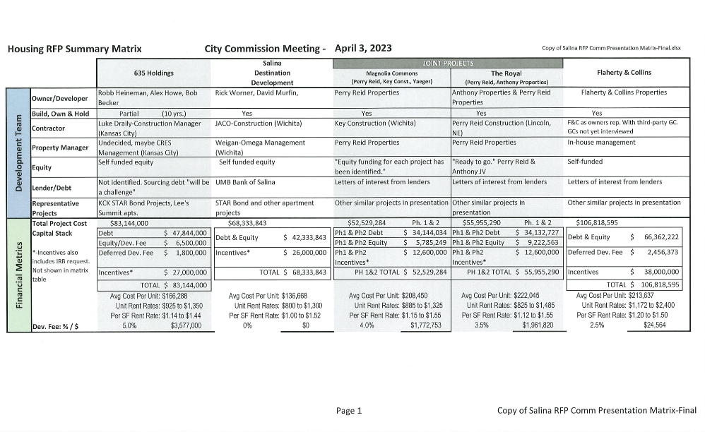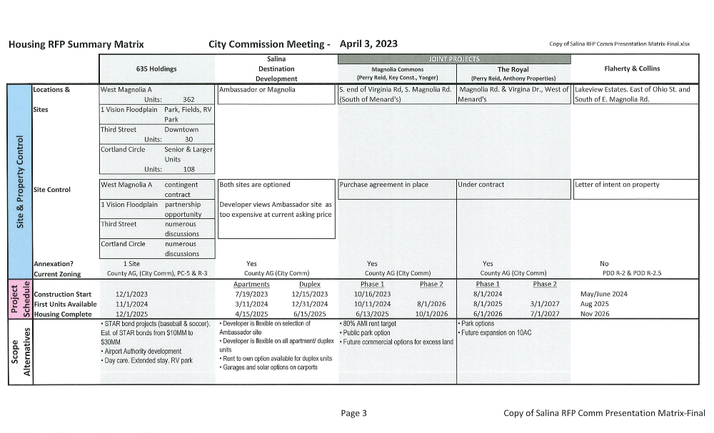 Pursuant to the Salina Market Rate Apartments Request for Proposals and the prior direction provided by the City Commission, four respondents were scheduled to make presentations to the City Commission on Wednesday, March 29 starting at 8:30 am and extending to 5:30 pm. Following the presentations and City Commission deliberation, direction was provided to staff to compile comparative information to assist the City Commission in continuing its deliberations in a special meeting scheduled for 1:30 pm on the following Monday, April 3.