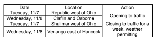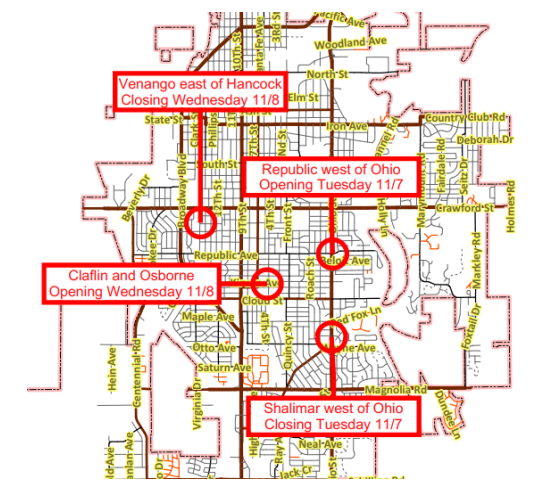 On Tuesday, November 7 and Wednesday, November 8, Morgan Brothers Construction of La Crosse, KS plans the following changes to City of Salina roads:
