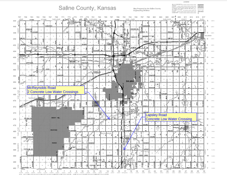 Saline County was awarded funds by the Kansas Department of Transportation through a program called βThe Kansas Local Bridge Improvement Program (KLBIP). This program will fund 85% of construction costs up to $350,000. Two bridge replacements on McReynolds Road between Halstead Road and Fairchilds Road was submitted for funding. The project includes removing the existing bridges and constructing a concrete low water crossing at each location.