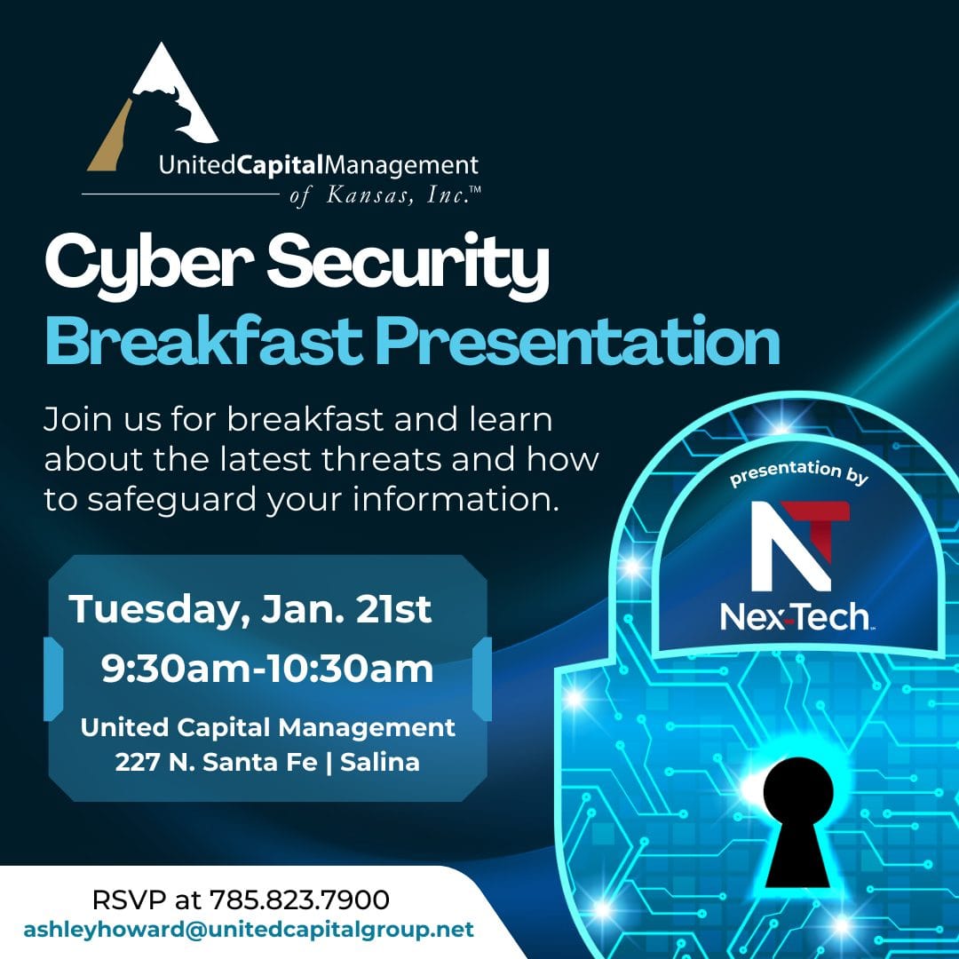 United Capital Management of Kansas, Inc. is excited to invite clients to an exclusive cybersecurity breakfast presentation in partnership with Nex-Tech. Attendees will gain valuable insights into the latest cybersecurity threats and learn practical steps to better protect both business and personal data.