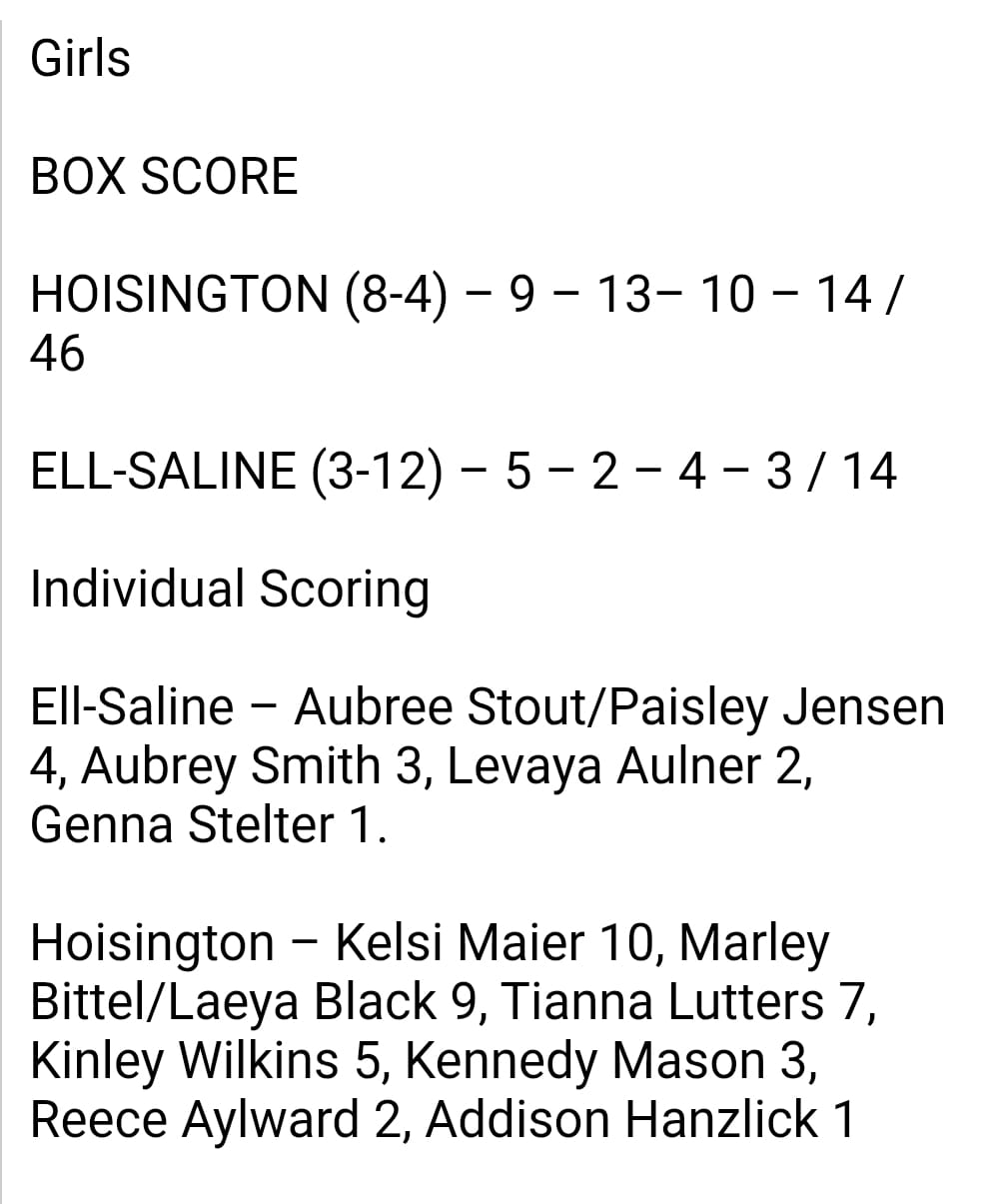 1-30-26: Ell-Saline was host to the Hoisington Lady Cardinals. Ell-Saline falls to Hoisington 14-46.