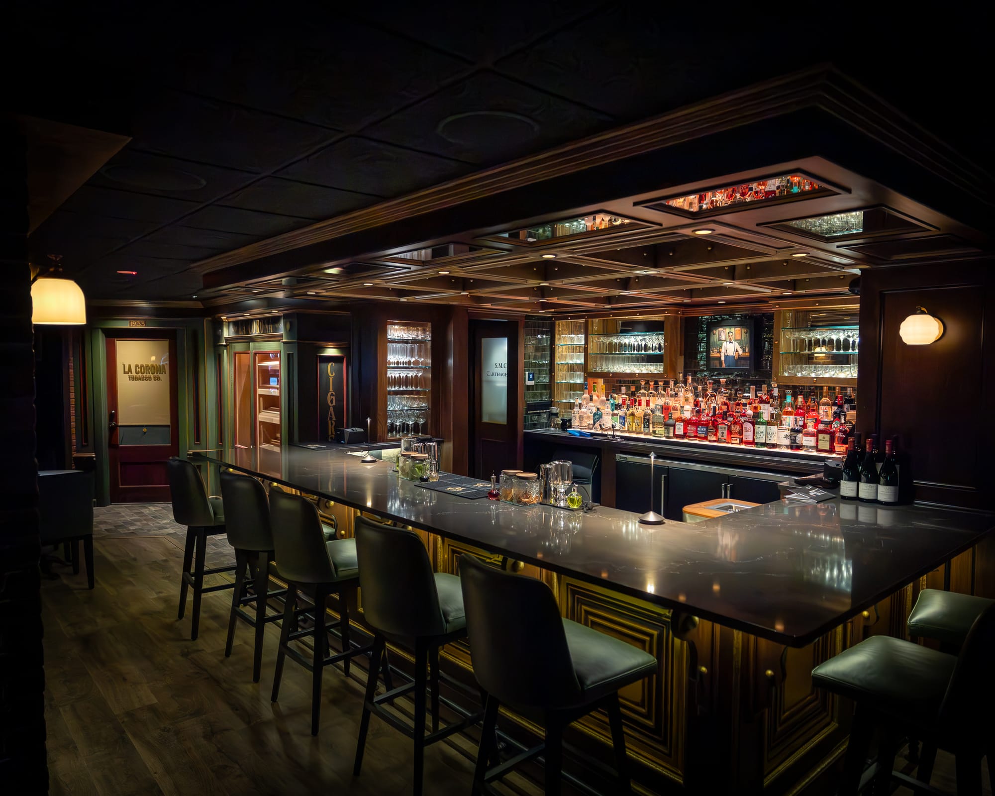 Inside, every element tells a story, from vintage fixtures to the red glow of the “M1918” sign that flickers above the entrance. Even the restrooms are extensions of the theme, crafted with the same attention to atmosphere as the main bar.