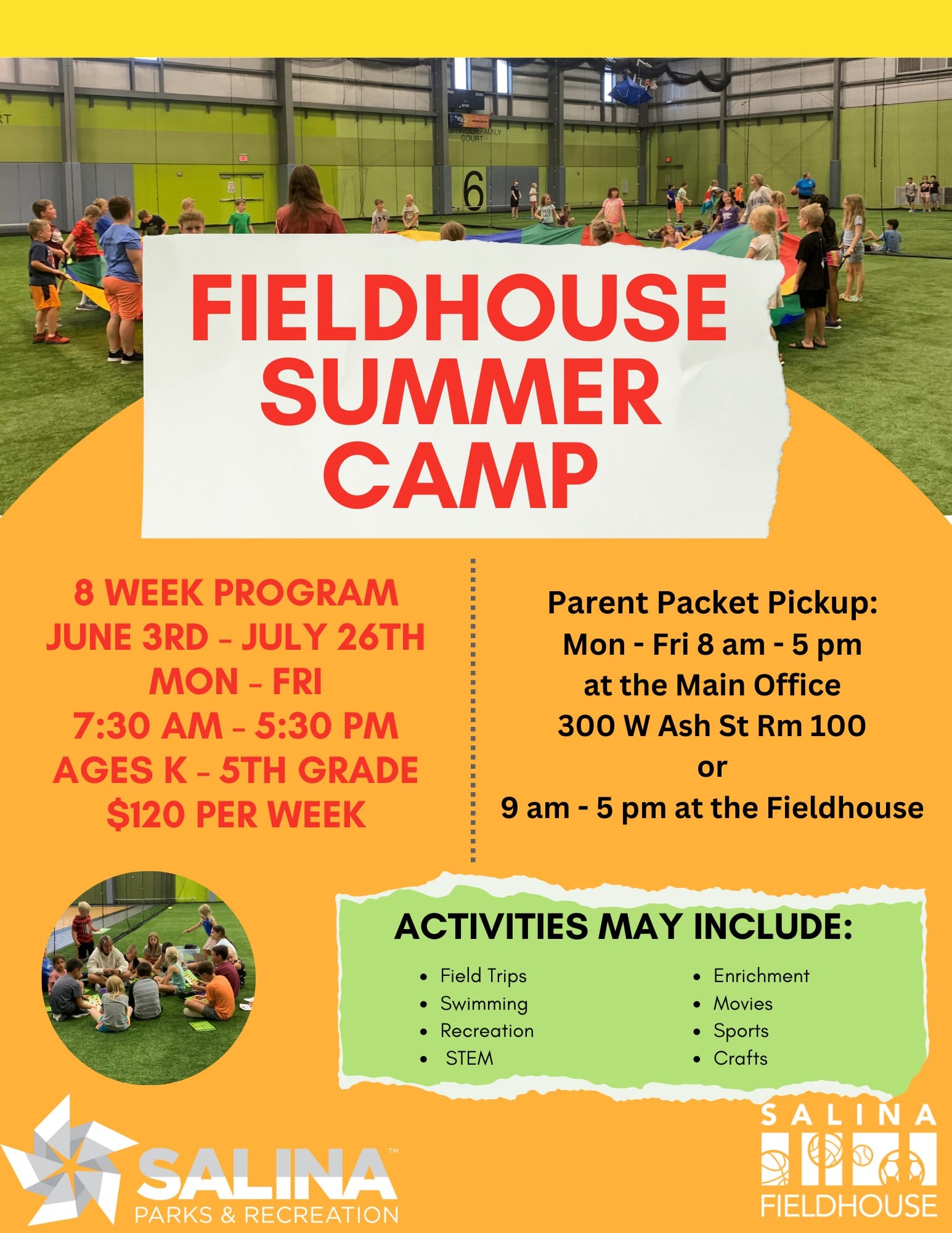 Get ready for a summer of fun as Fieldhouse Summer Camp returns. Camp Packets are now available for pickup at the Salina Parks and Recreation office, situated at 300 W. Ash, Rm #100, or at the Salina Fieldhouse, conveniently located at 140 N. 5th Street.
