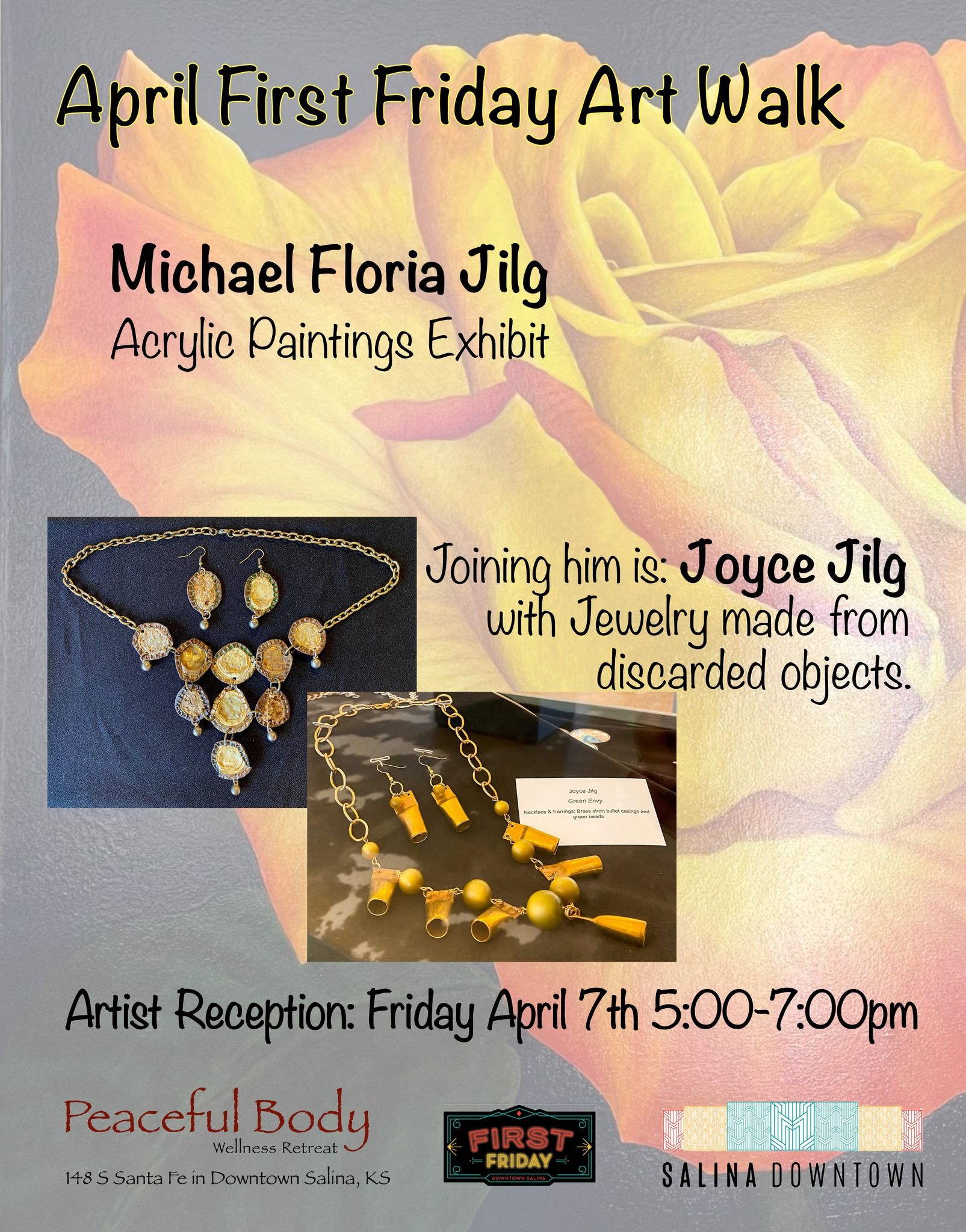 Salina's Downtown is ready to welcome back First Friday on April 7. The Peaceful Body Wellness Retreat, located at 148 S Santa Fe, will host an Art Walk from 5-7 pm, featuring an acrylic painting exhibit by Michael Floria Jilg and discarded object jewelry made by Joyce Jilg. The City Lights Stage will also be bringing live music, with the New Brown Band performing from 6-8 pm. Don't miss out on this exciting opportunity to enjoy the arts and music in the heart of Salina.