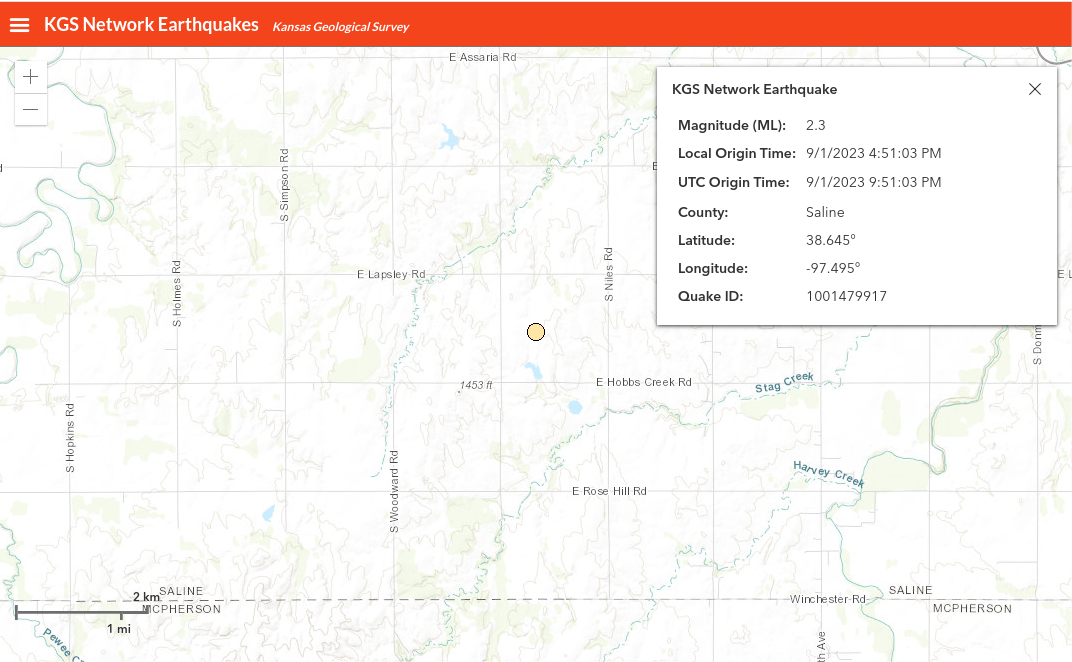 The Kansas Geological Survey recorded an earthquake on Friday, September 1. The quake registered a 2.2 on the Richter Scale and struck at 4:27 am. It was located near E Hedberg and S Holmes.