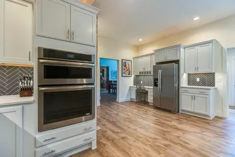 - Chef’s Kitchen: Gas range, wall oven, convection microwave, farmhouse sink, walk-in pantry, built-in desk, and original exposed brick accents.