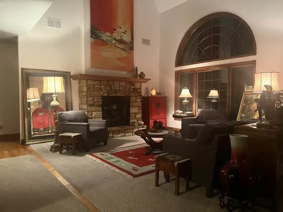 ā Living Room with Stone Fireplace ā Cozy yet elegant, featuring high ceilings and a stunning gas fireplace.