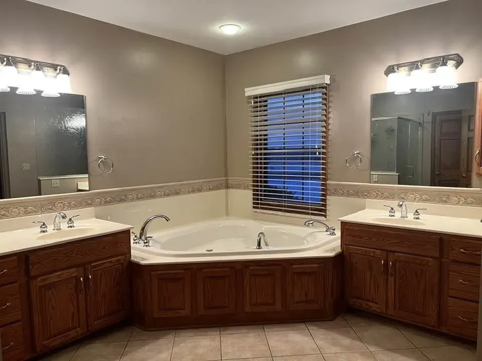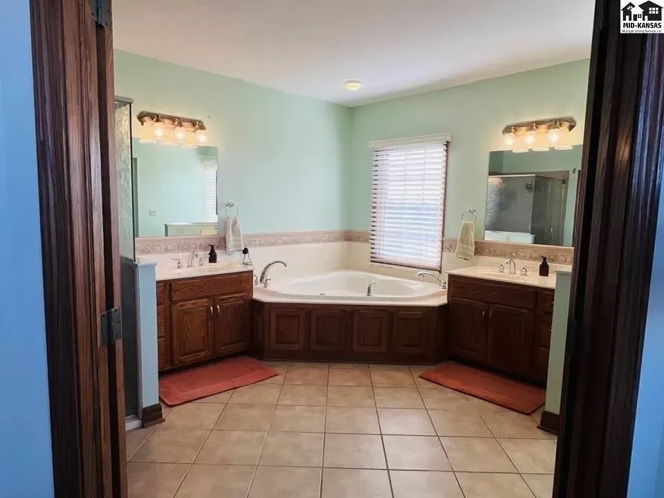 ā Luxury primary bathroom with double sinks, a large shower, and a jacuzzi tub for ultimate relaxation.