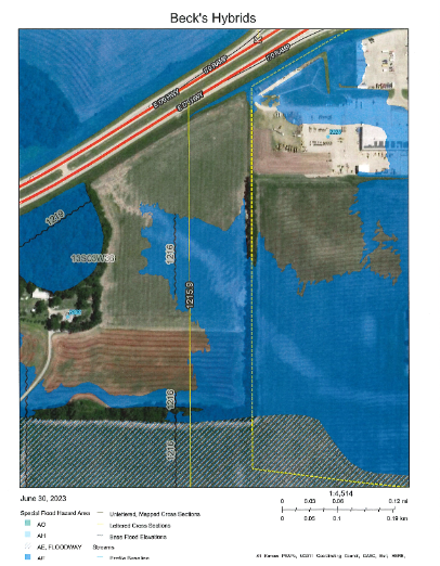 Beck's Hybrid Seeds was able to reach agreement with the Ward Family Trust and now has a contract to purchase 35.23 acres of the Wards property, 19.80 acres of which they are proposing to annex, rezone and plat. Beck's has filed amended applications to rezone and plat a 23.92 acre development site/ platted building lot which includes 4.12 acres they are purchasing from DK Farm and Ranch. This 150 ft. wide strip of land provides access from the Ward Trust property (the proposed building site) out to Ohio Street.