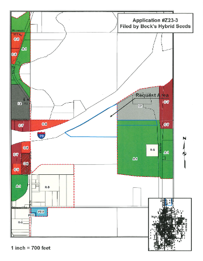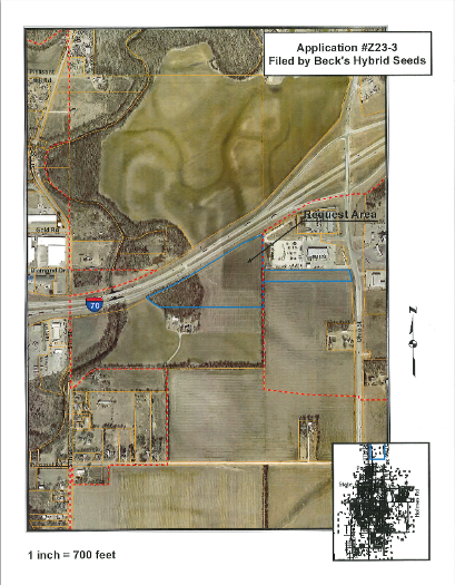 At Monday's City Commission Meeting, Commissioners discussed an application filed by Beck's Hybrid Seeds, requesting a change in zoning district classification from A-1 (Agricultural) to I-2 (Light Industrial) to allow construction of a sales office and warehouse space. The rezoning request area is a 23.92 acre tract of land located on the west side of North Ohio Street south of 1-70, directly south and west of Foley Equipment Company.