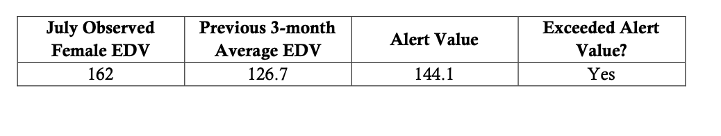 In the month of July 2023, 162 suicide-related events occurred in Kansas among females. This is greater than two standard deviations above the previous 3-month mean of 126.7 (Table 1).