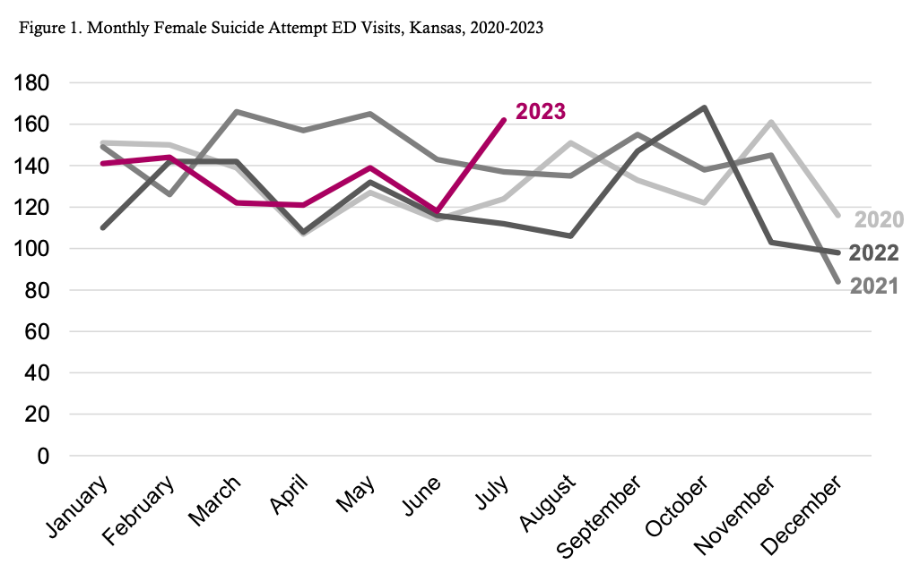 In the month of July 2023, 162 suicide-related events occurred in Kansas among females. This is greater than two standard deviations above the previous 3-month mean of 126.7 (Table 1).