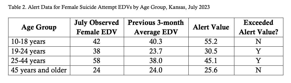 During routine surveillance of emergency department visit (EDV) data, KDHE detected a spike for suicide attempts among female patients in July 2023. A spike alert identifies when the number of emergency department visits for suicide attempts is at a level greater than two standard deviations above the previous three-month average.