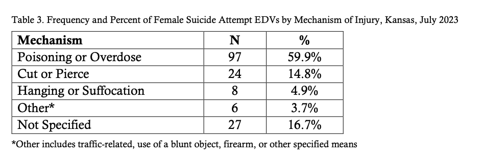 Mechanism of injury could be extracted for 83.3% of female suicide attempt visits. Nearly 60% of females presented to the ED for poisoning or overdose (Table 4).