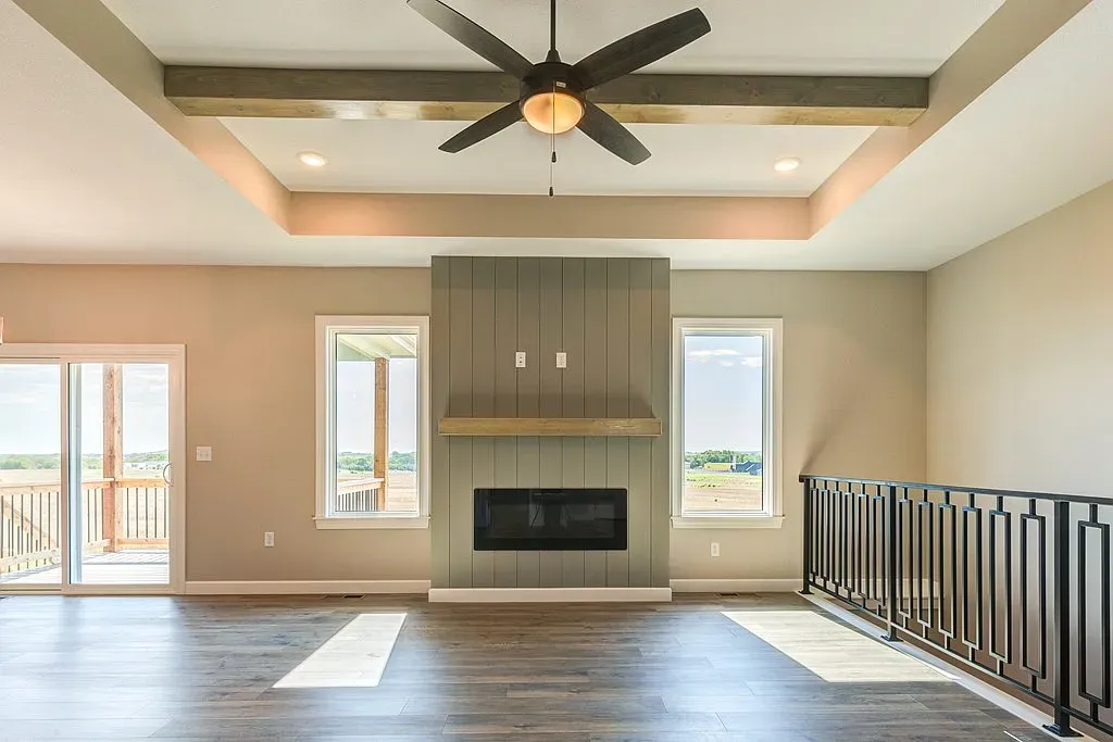- Cozy Features: Electric fireplace with floor-to-ceiling painted shiplap and a stained mantle.