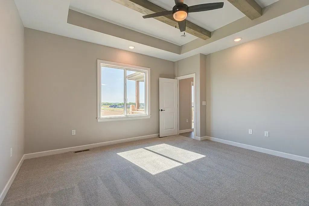 - Primary suite with 10' ceilings, stained beams, walk-in closet, dual vanities, and a walk-in tile shower.