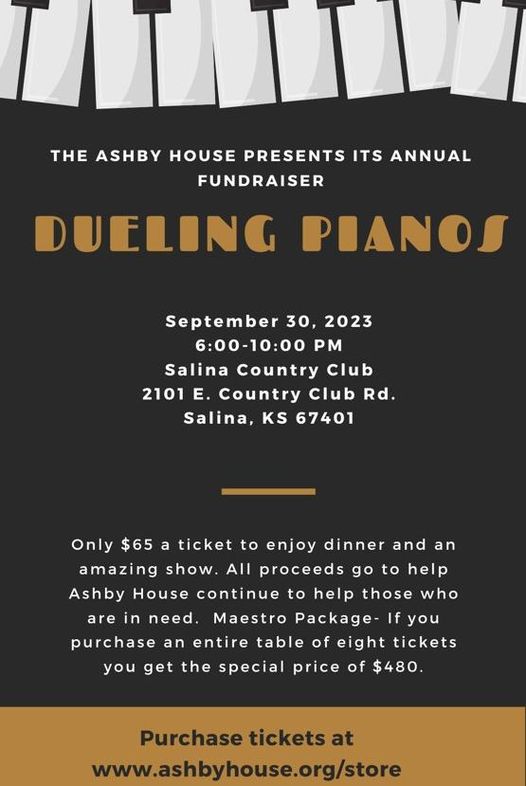 Salina's most awaited event of the year is here, and you're cordially invited to the Dueling Pianos Gala, hosted by Ashby House. This sensational evening promises an enchanting blend of music, laughter, and delectable dining, all for a remarkable cause. Mark your calendars for September 30, from 6-10 pm, at the exquisite Salina Country Club, located at 2101 E Country Club Rd.