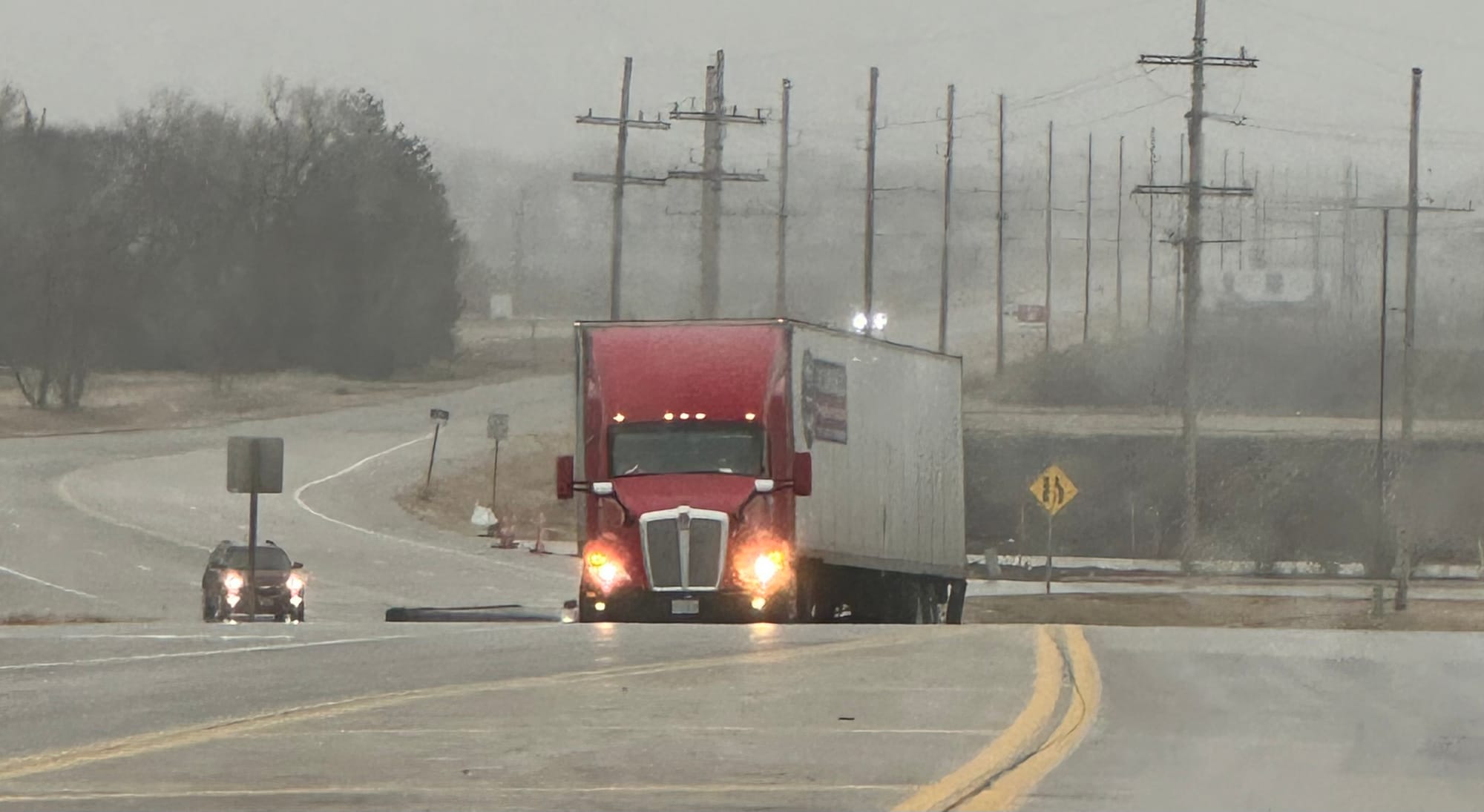 A semi-truck is unable to make it up the hill to the I-70 onramp on Ohio Street due to the challenging weather and road conditions.
