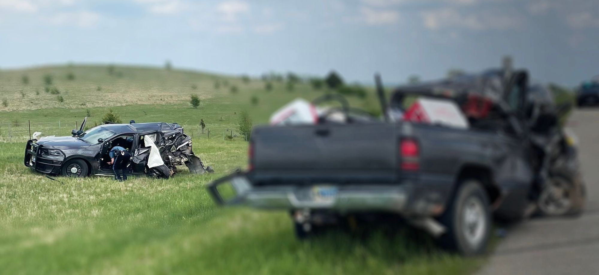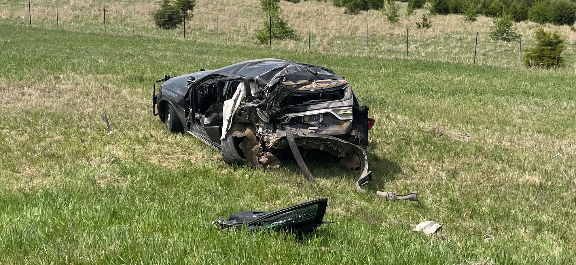 The KHP report indicates that the accident occurred 2:05 pm, on I-70 at mile marker 248 westbound, or 2 miles west of the intersection of I-70 and I-135. A 2021 Dodge Durango, driven by KHP Trooper Steven Sneath of Geneseo, Kansas, was legally stopped on the westbound shoulder of I-70 near mile marker 249 performing a motorist assist, with the patrol vehicle's emergency lights activated. A 2001 Dodge Ram 2500, being driven by a 61-year-old male from Rock Springs, Wyoming, was westbound on I-70 when it entered the shoulder lane and struck the rear of the patrol vehicle.