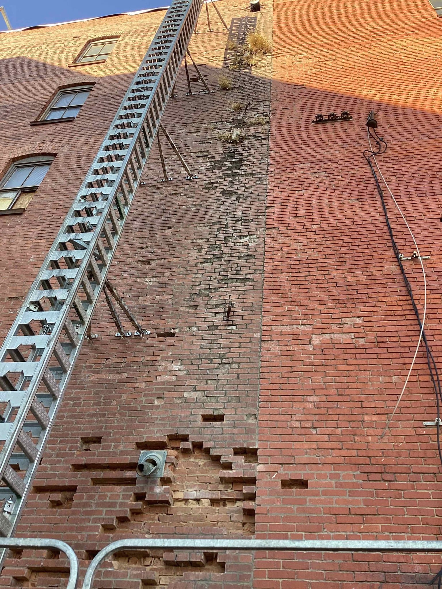 The masonry contractor is engaged in large-scale brick tuck-pointing, addressing both exterior and interior repairs above windows. - Demolition Milestones: