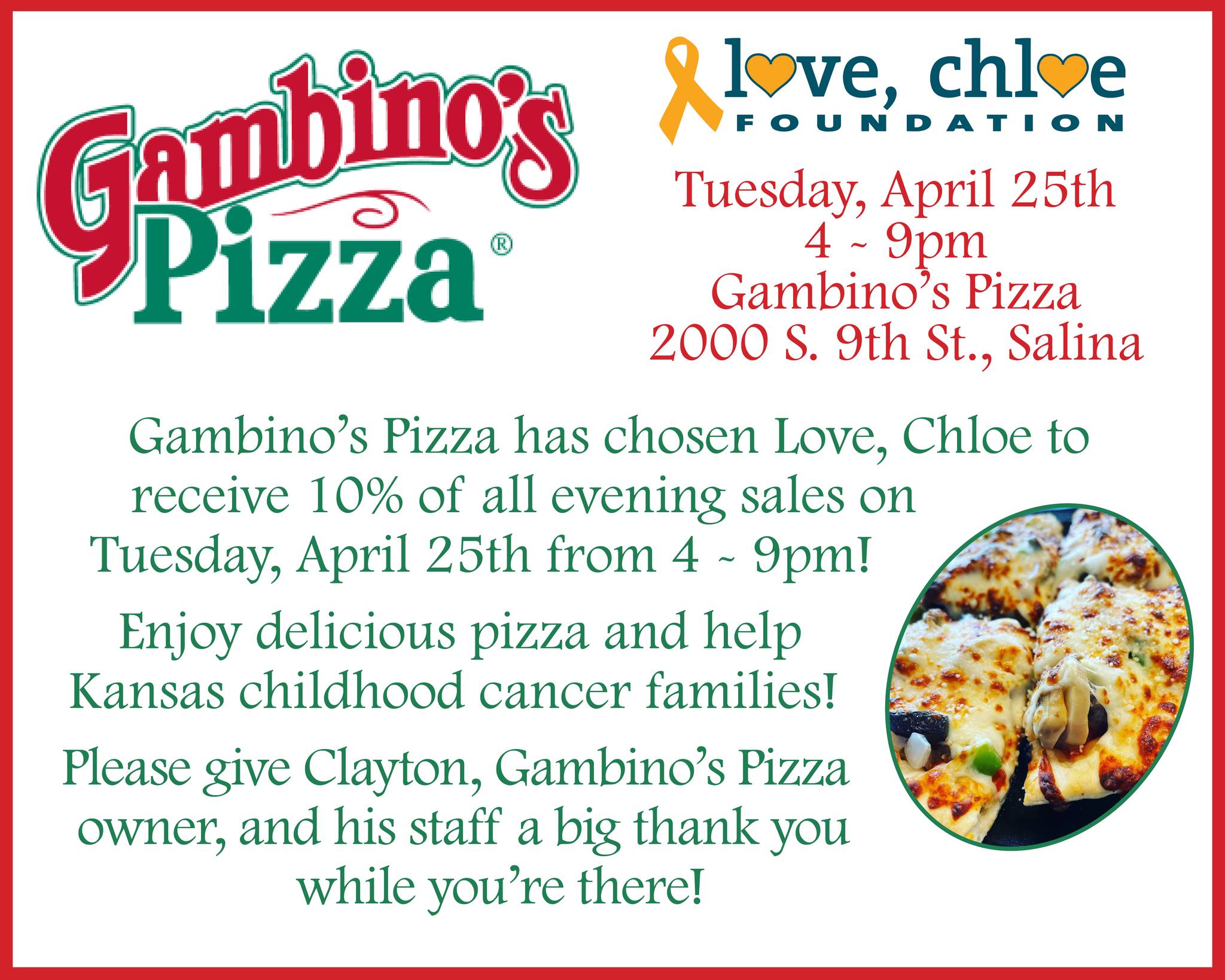 Join Love, Chloe Foundation at Gambino's Pizza on Tuesday, April 25, for a great cause. Their upcoming fundraiser will be held from 4-9 pm, and they invite you to indulge in some mouthwatering pizza while supporting Kansas families who are facing the challenges of childhood cancer. Don't miss out on this opportunity to make a difference in our community.