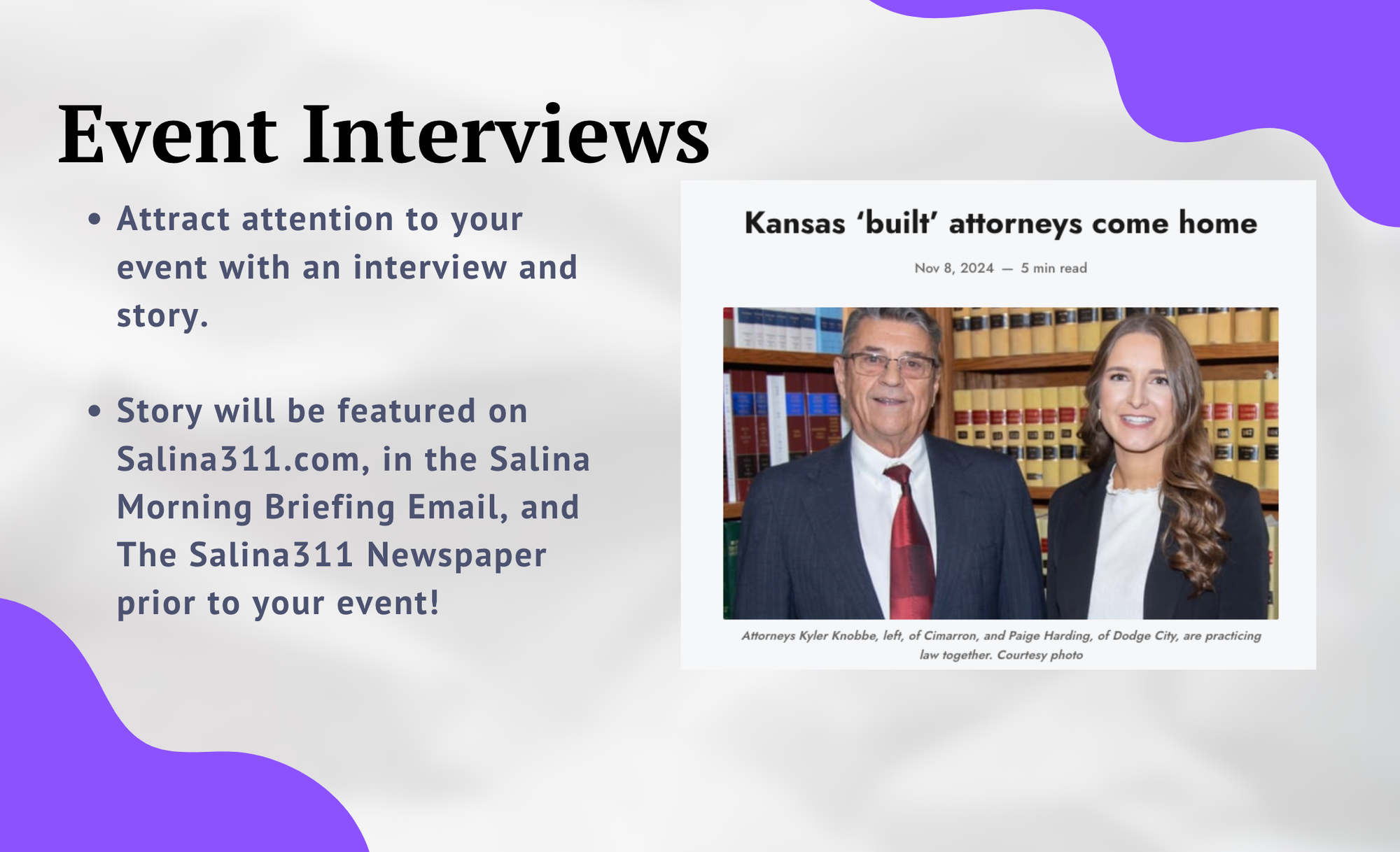 Salina311 has been great to work with and does great work designing our ads. Nothing beats having your ad in the daily email briefing that goes out every morning, there is no better way to get your brand out to the public in Salina. The return on investment is the best in town.Nathan Knopf