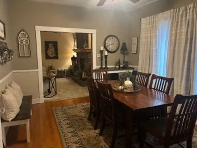 Inside, the living room centers around a stone gas fireplace, creating a natural focal point. A formal dining room sits adjacent to the kitchen, which includes a breakfast nook with a built-in table. The home also features two staircases leading to the upper level, a unique architectural detail from the era.