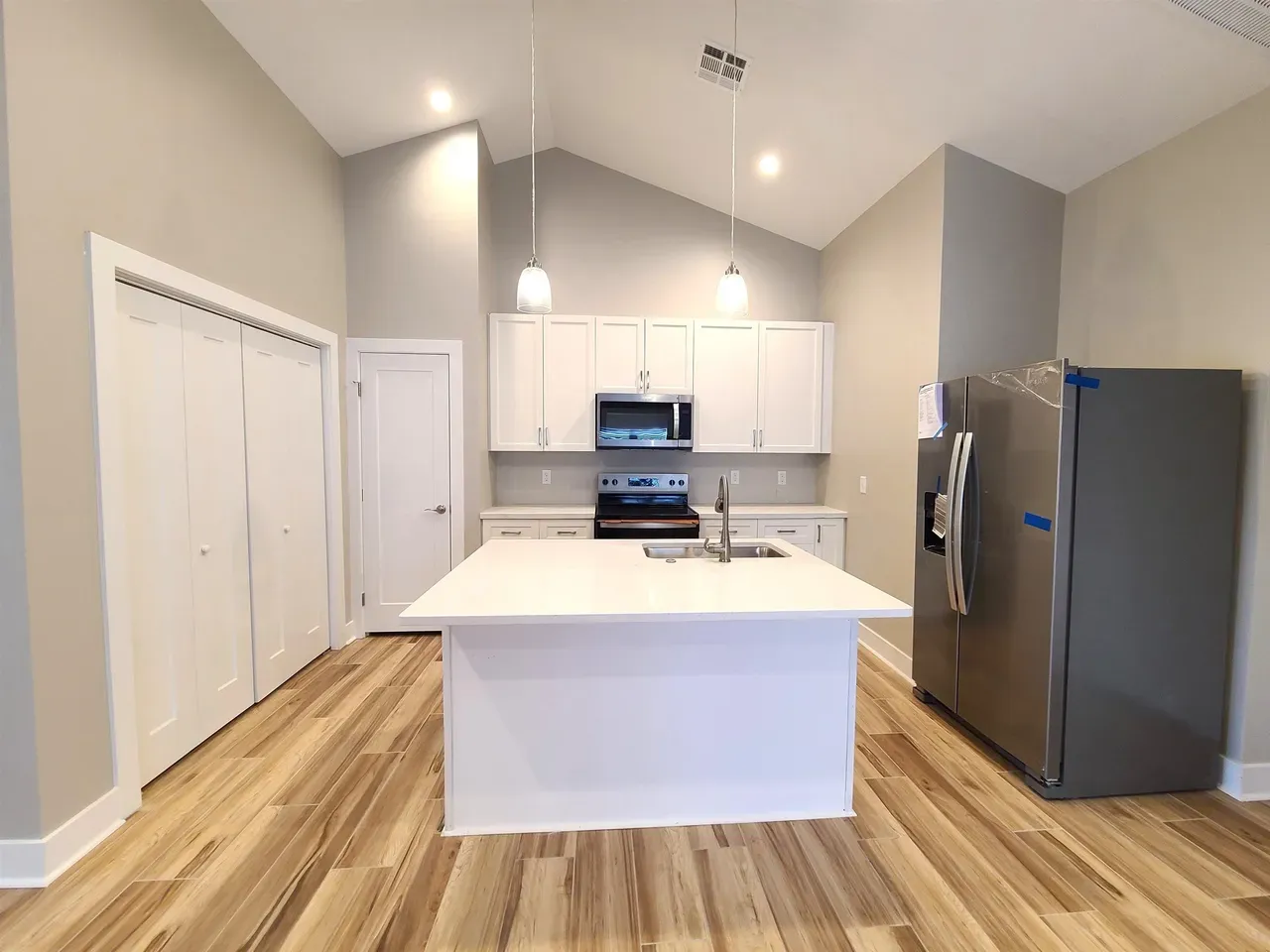 The great room boasts vaulted ceilings and an open floor plan that seamlessly connects the kitchen, dining, and living areas. The kitchen is equipped with stainless steel appliances, ample counter space, and two pantries—each with built-in plug-ins. There’s plenty of room for barstools at the island as well as a kitchen table.