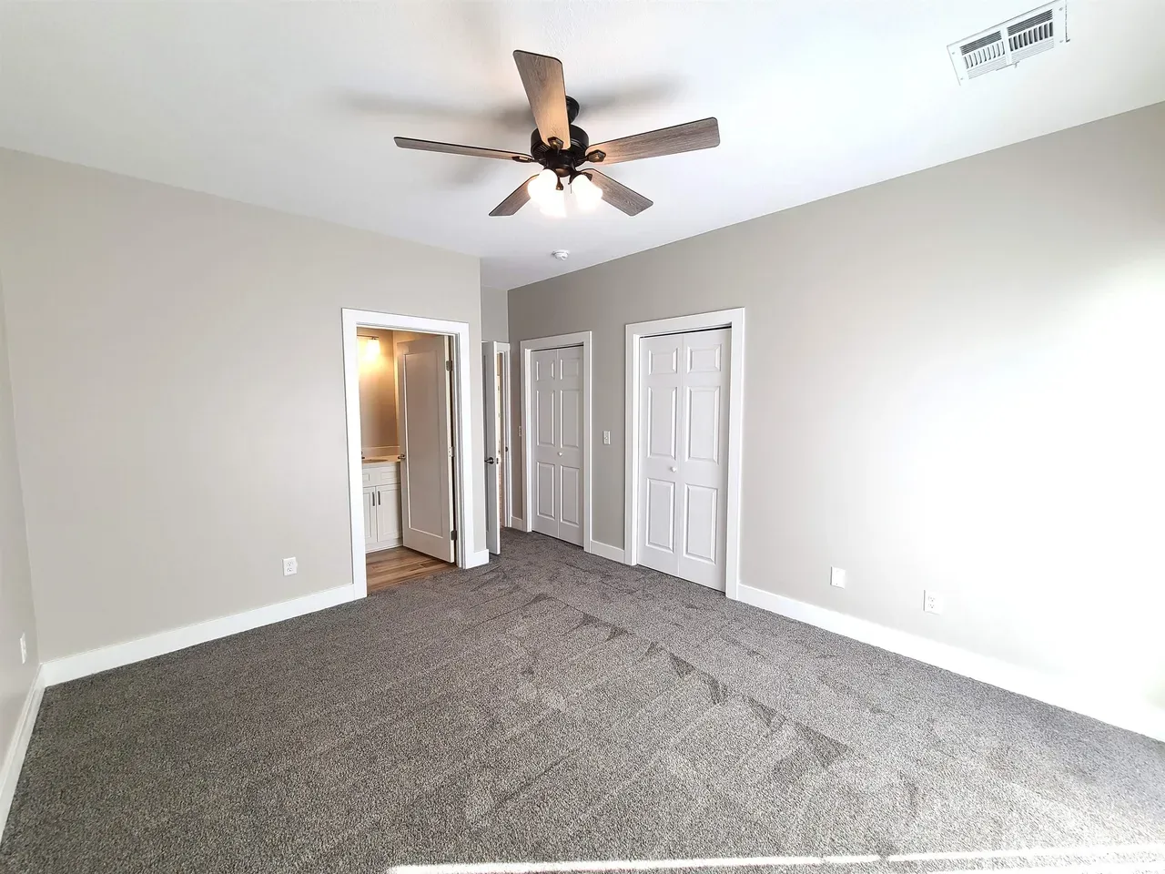The master bedroom includes double closets, a walk-in shower, and a sliding glass door that opens to the back patio. The second bedroom features generous storage, while the second bathroom includes a tub/shower combo.