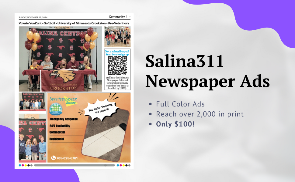 - Newspaper Advertising: Traditional print advertising packages in the Salina311 Newspaper, offering excellent value at $100 for two ads per week for an entire month.