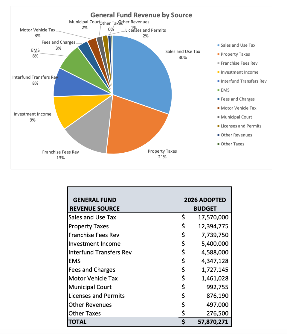 The proposed General Fund budget for 2026 totals $57,870,271, according to financial documents released by city staff. The General Fund is the city’s primary operating fund and supports services including police, fire, public works, parks, and general administration.