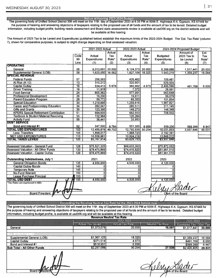 2022 Delinquent Real Estate Tax List and Notice of Sale as of August 1, 2023. Listed below are the names of owners of real estate, the description, and address, if available, of each tract or parcel and the total amount of the unpaid taxes for 2022. If the tax and interest are not paid before the first Tuesday of September, being September 5, 2023, the tract or parcel of land will be sold to the County, no other bidders being allowed, for the amount of delinquent tax and legal charges as provided in KSA 79-2302; 79-2303. Some of the names listed below may have already paid, or may be awaiting results of a tax protest hearing. Unfortunately, it is not possible to remove these names from publication due to statutory requirements. Although these procedures are required by law, the County Treasurer regrets any undue embarrassment this publication may cause those who have paid taxes after the publication deadline. Jim DuBois, Saline County Treasurer.