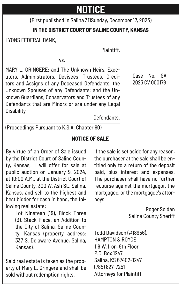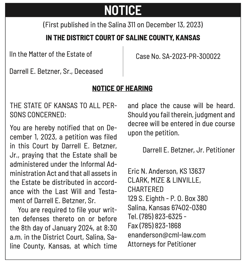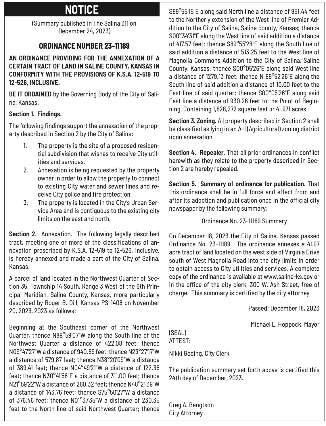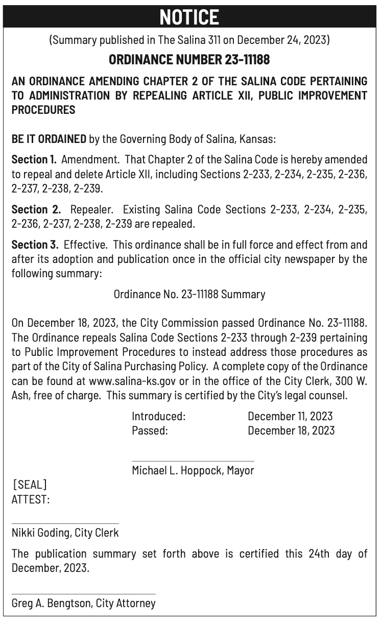 Notices published in the Salina311 Newspaper on December 20th, 24th.π‘This story was featured in the Salina311 Newspaper. Subscribe To The Paper