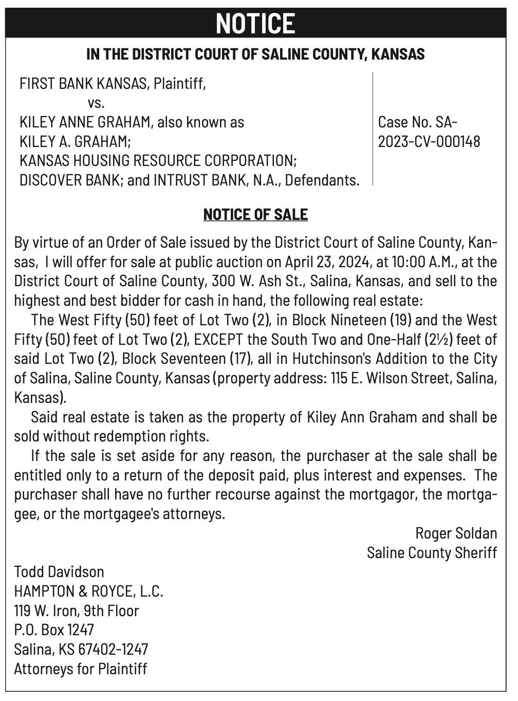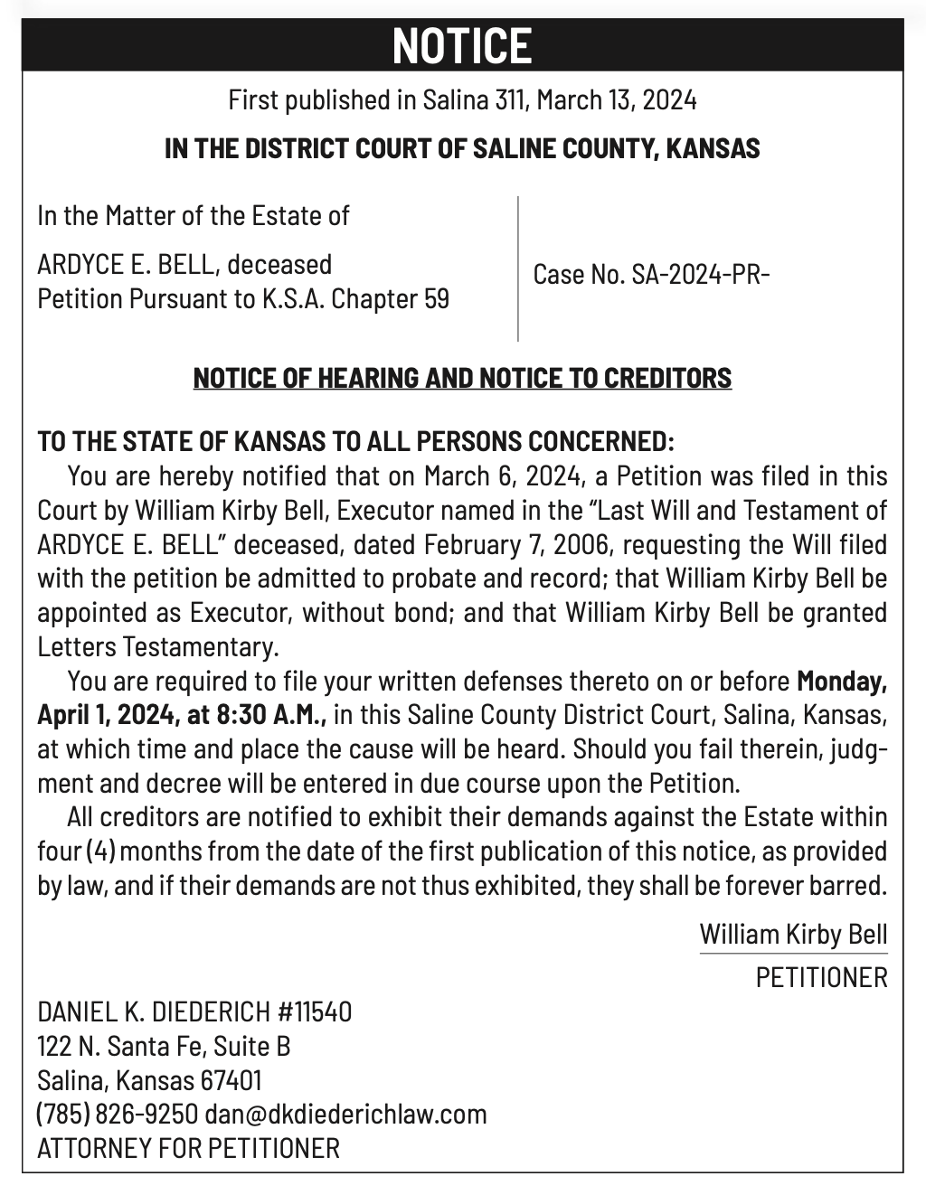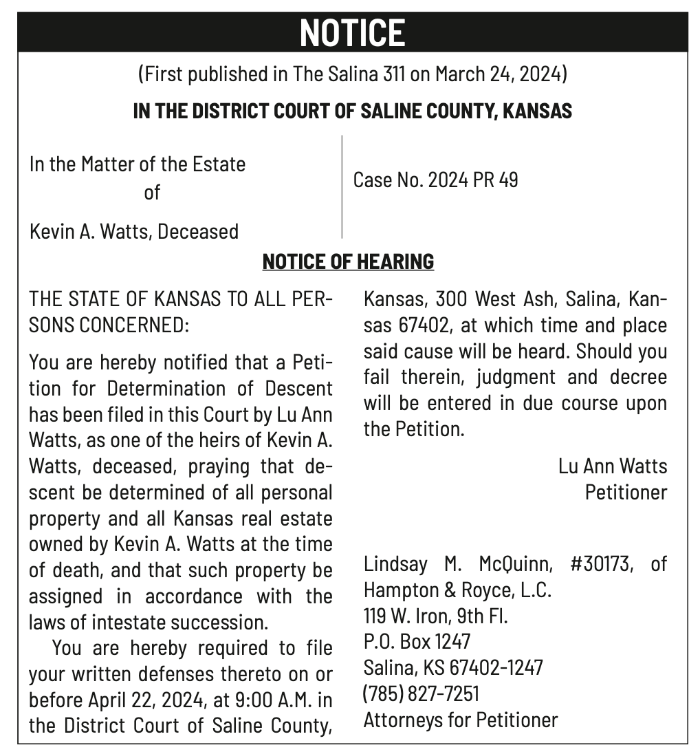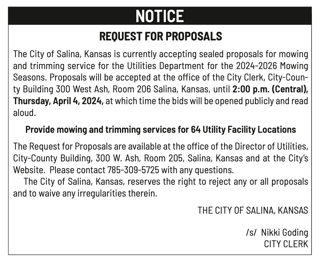 Public notices published in the Salina311 Newspaper on March 27th and March 31st.