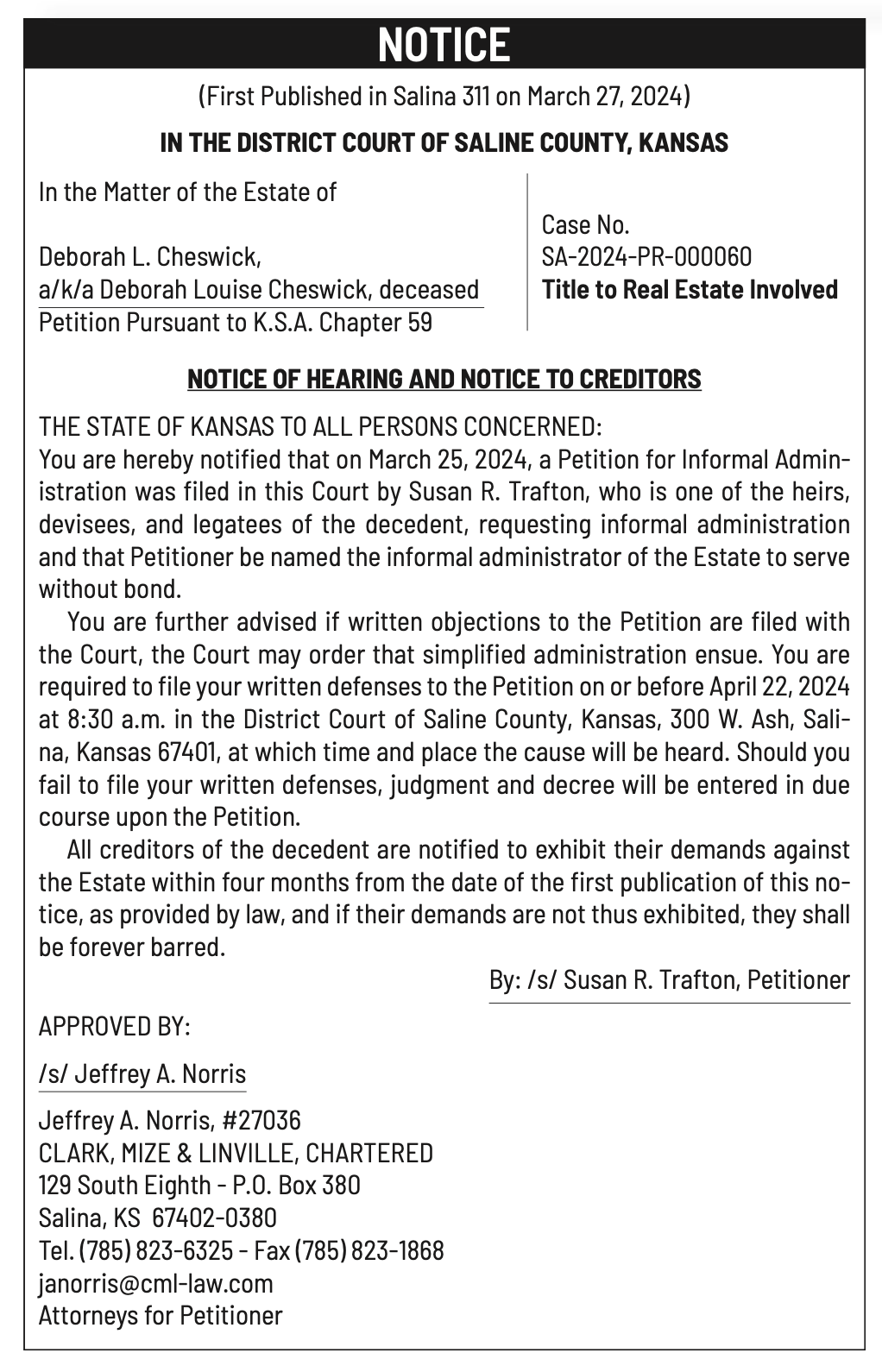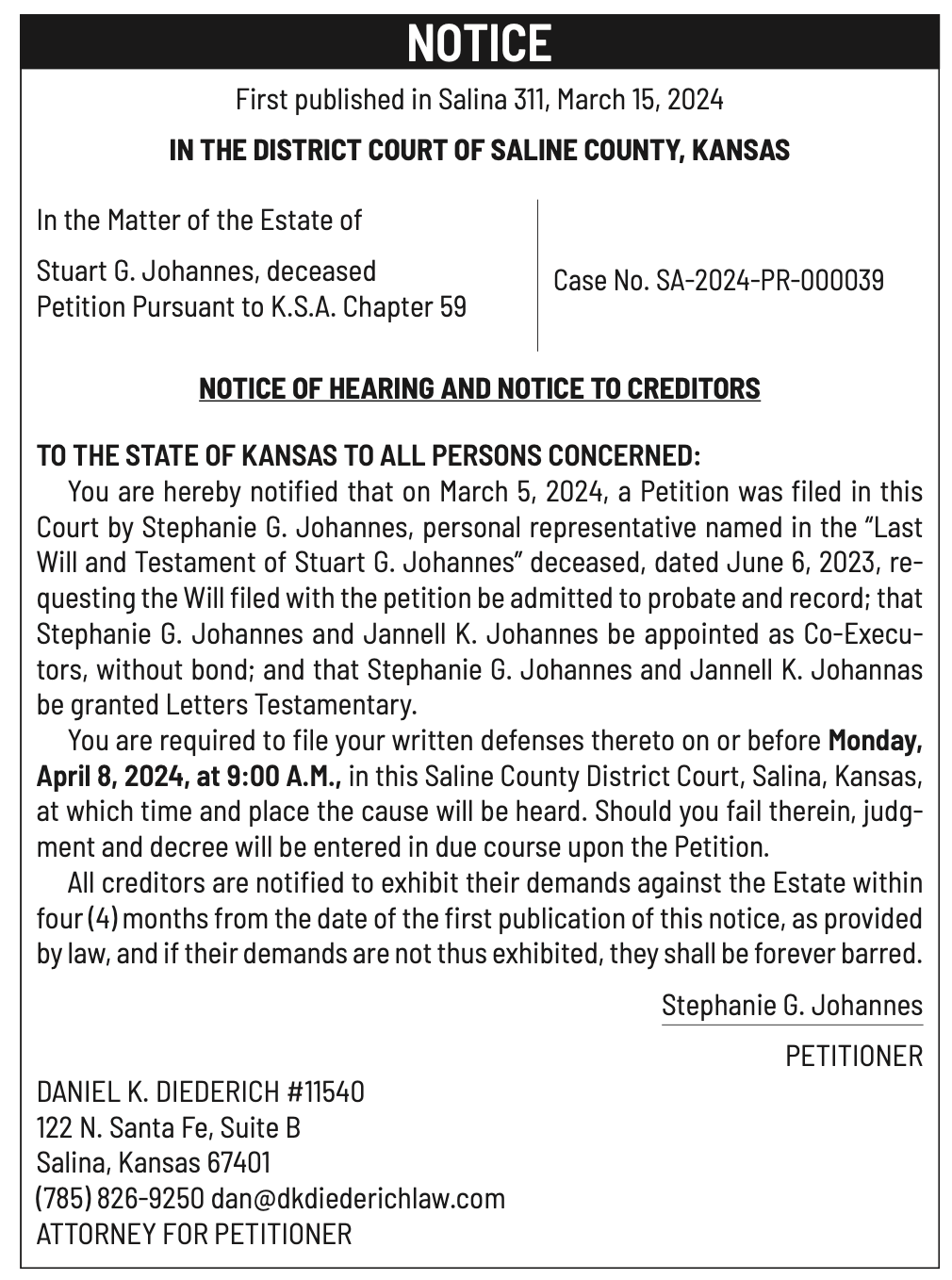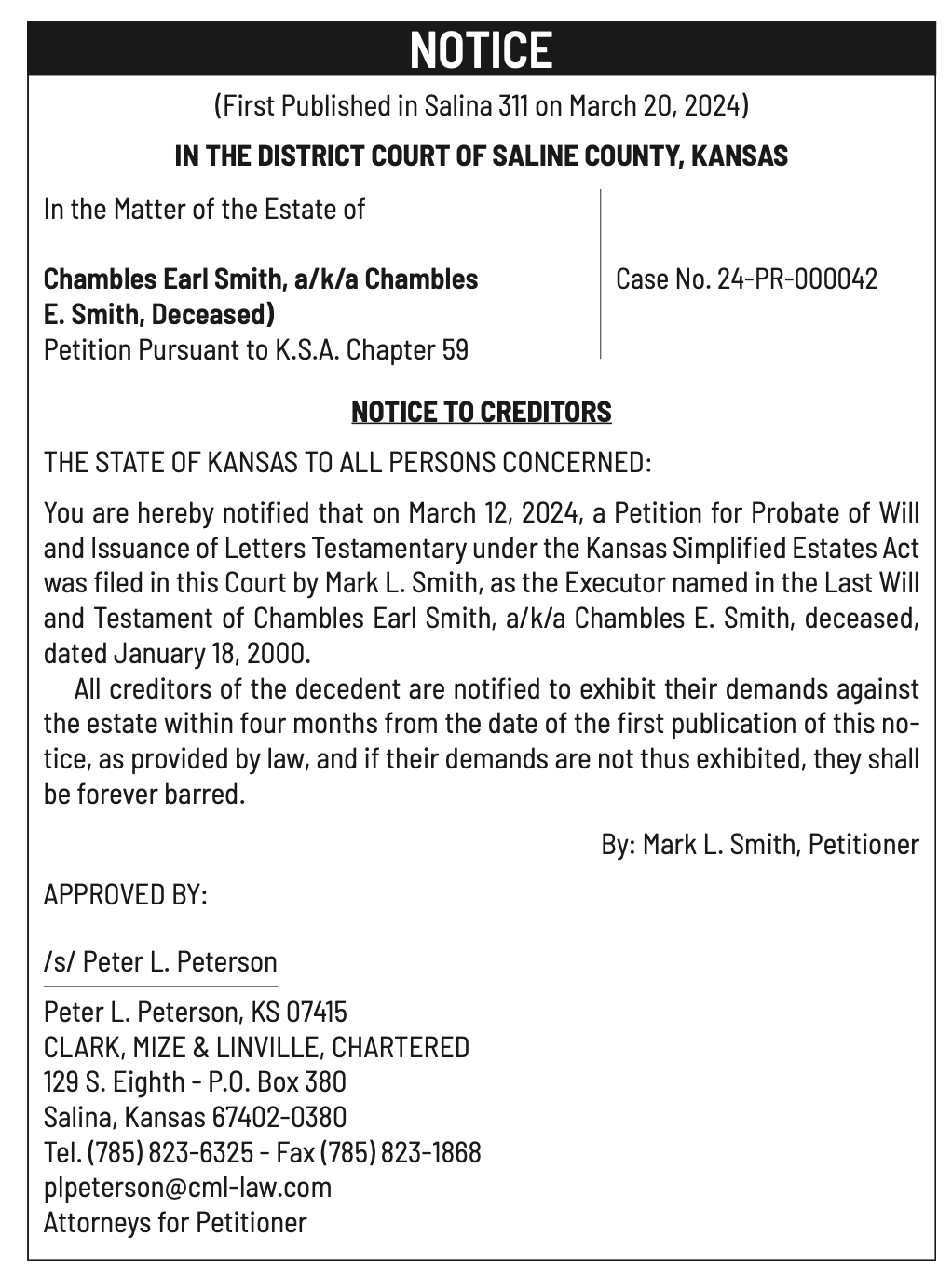 Public notices published in the Salina311 Newspaper on March 27th and March 31st.
