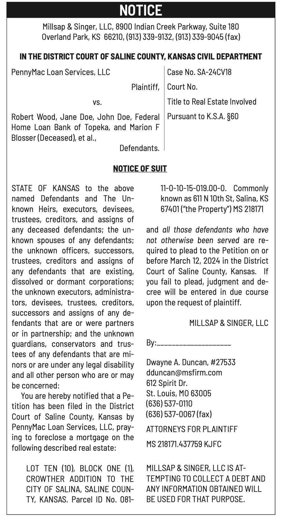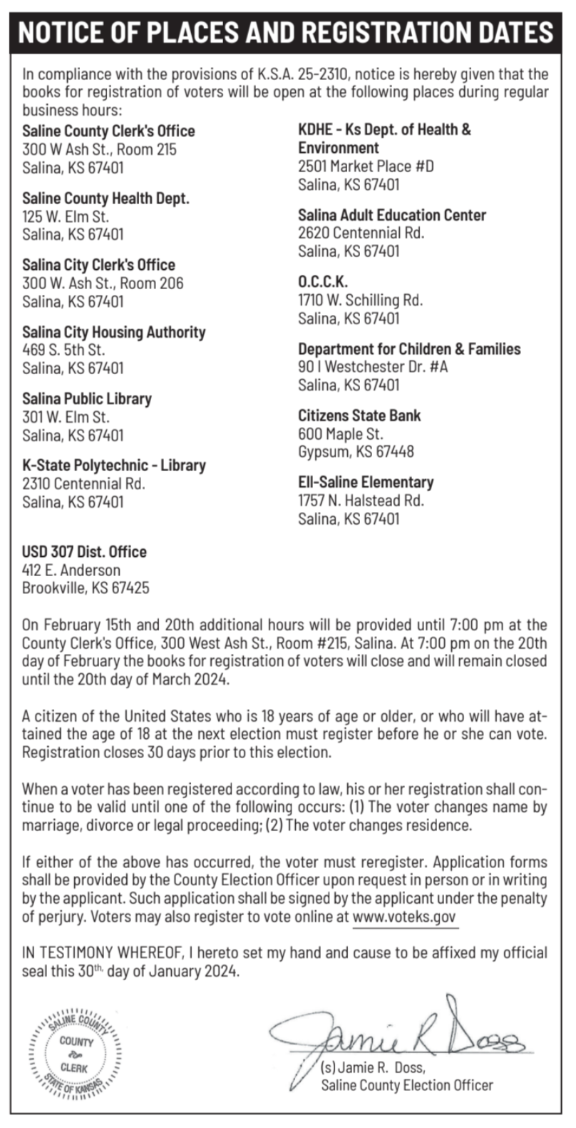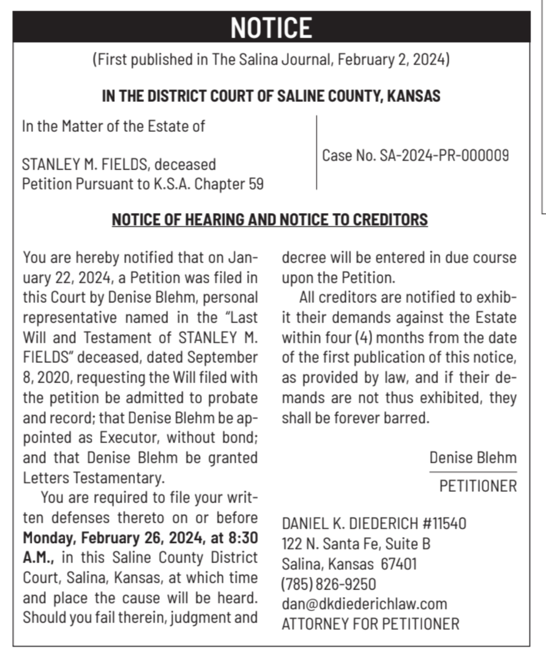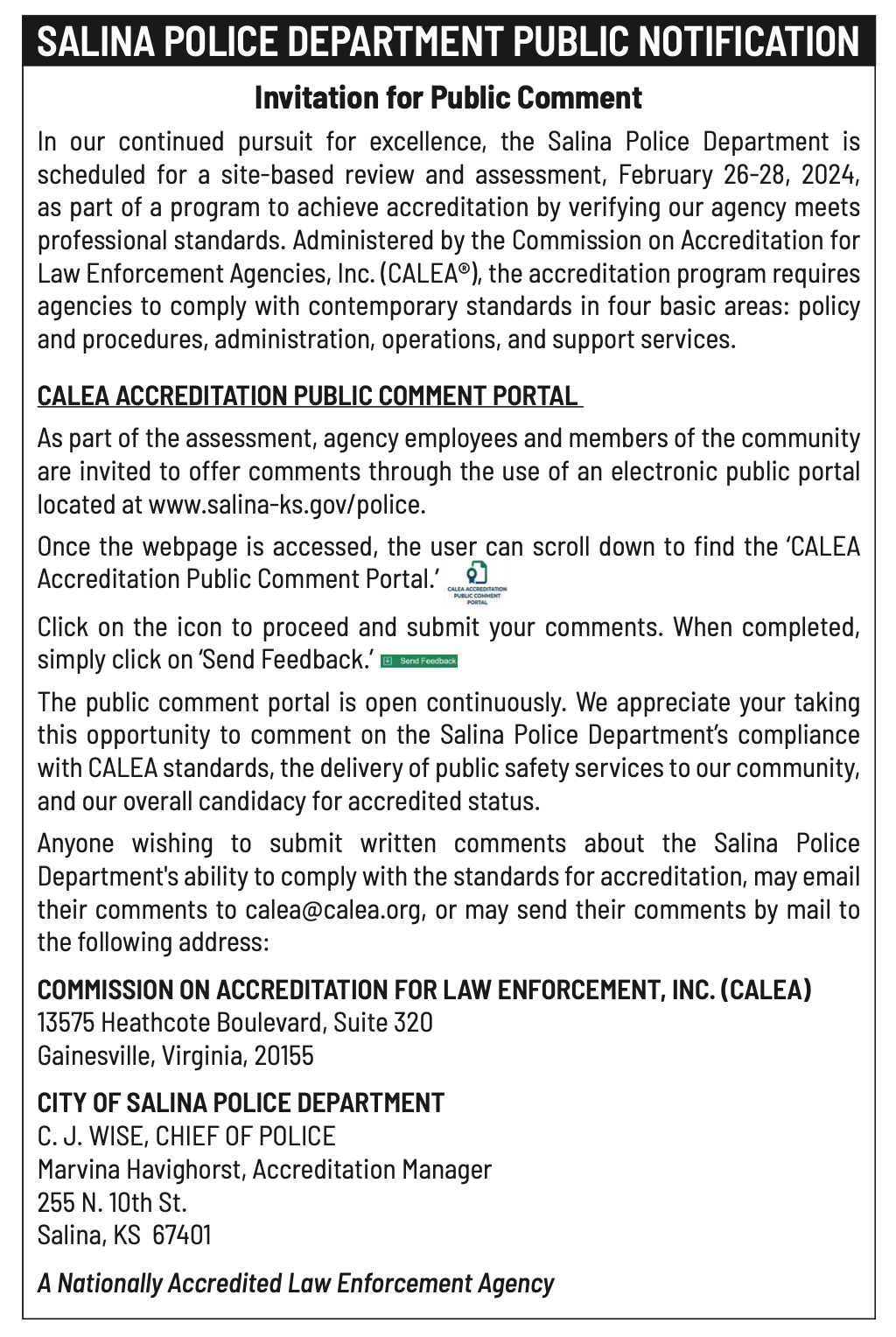 Public notices published in the Salina311 Newspaper on January 31, February 4, and February 7.