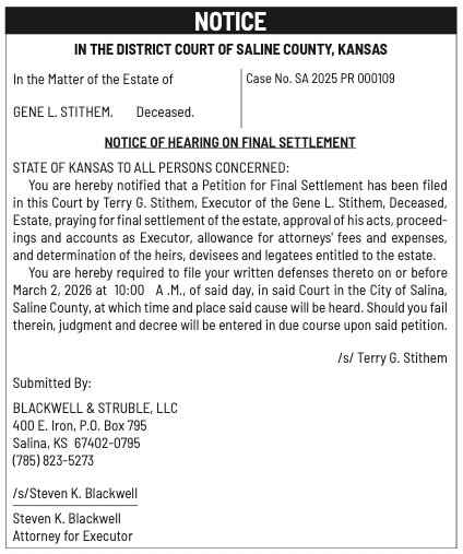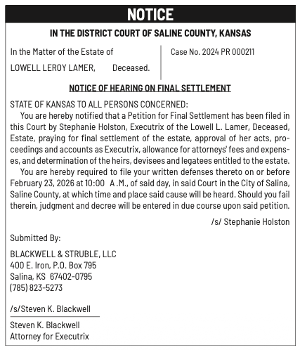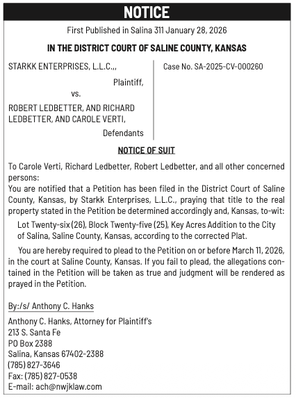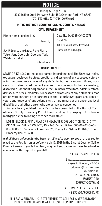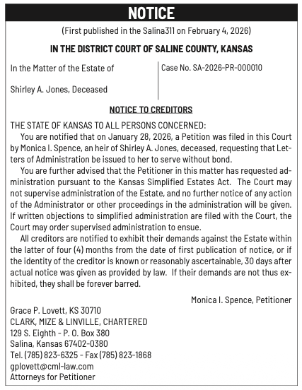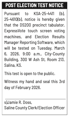 Public notices published in the Salina311 Newspaper on February 8th and/or February 4th.