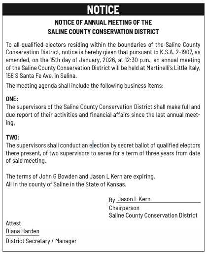 Public notices published in the Salina311 newspaper on January 25th and/or January 21st.