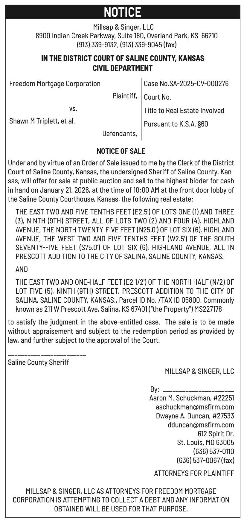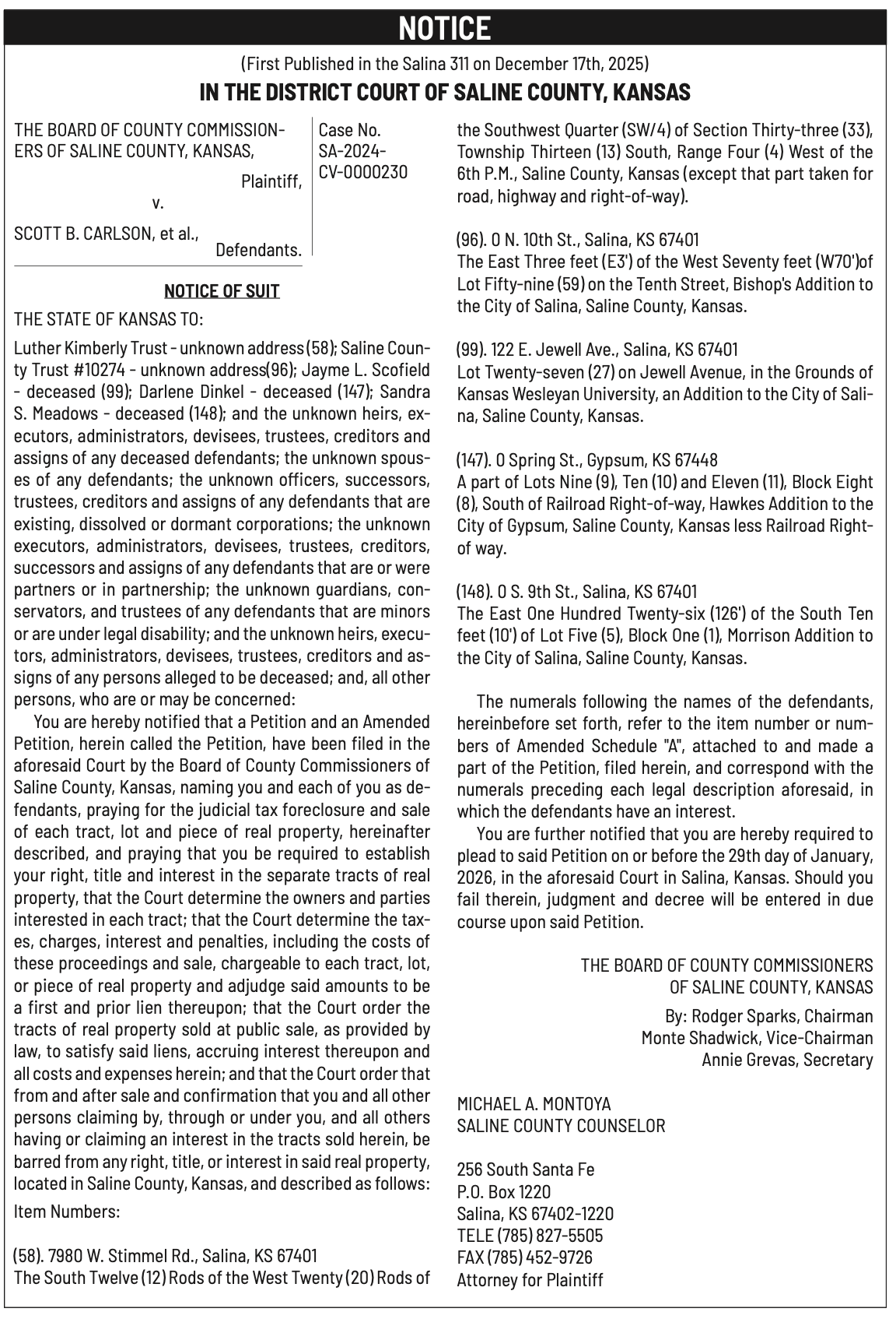 Public notices published in the Salina311 Newspaper on January 4th and/or December 31st.